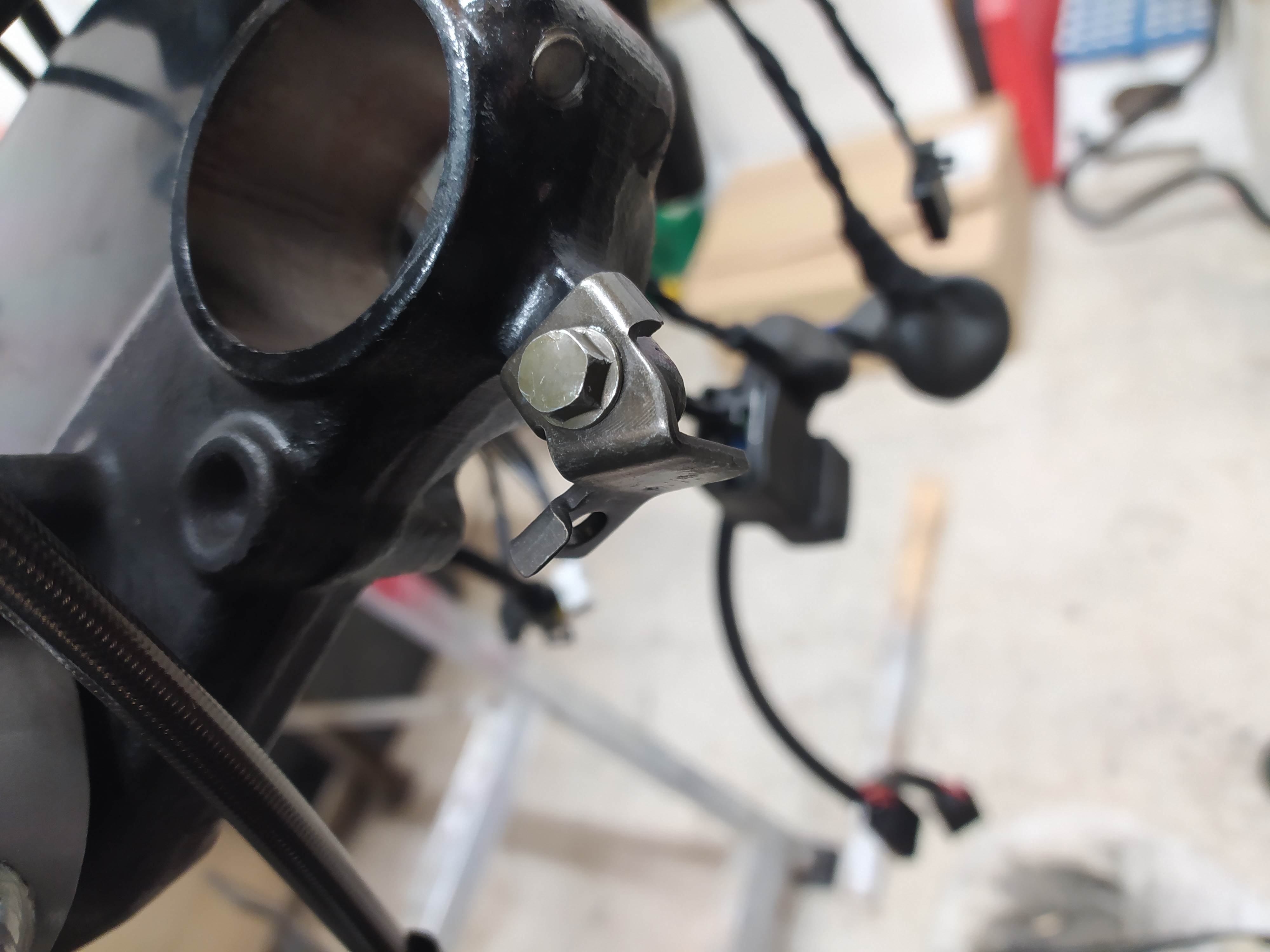 Fabrique une patte plate fine avec trous de 6 mm et 8 mm, et fixée sur la vis du bas du té, pour voir si ça équilibre un peu plus les longueurs.