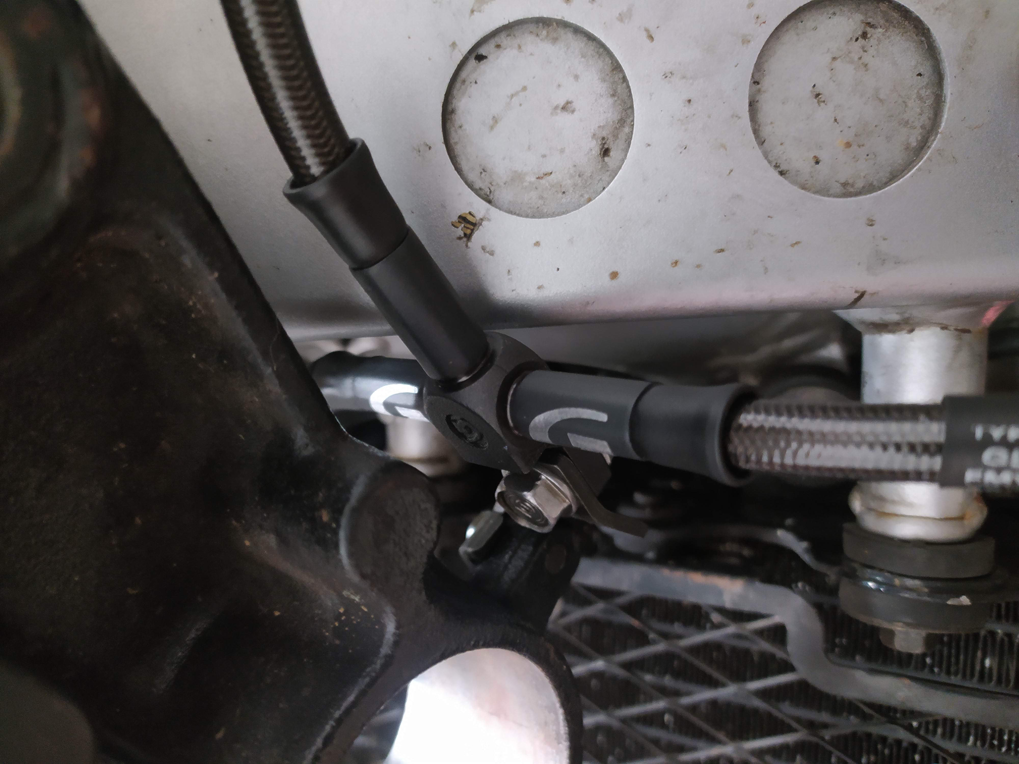 Le raccord en T est mal fichu pour le mettre en place à son emplacement et la durite de l'étrier droit est bien trop longue.