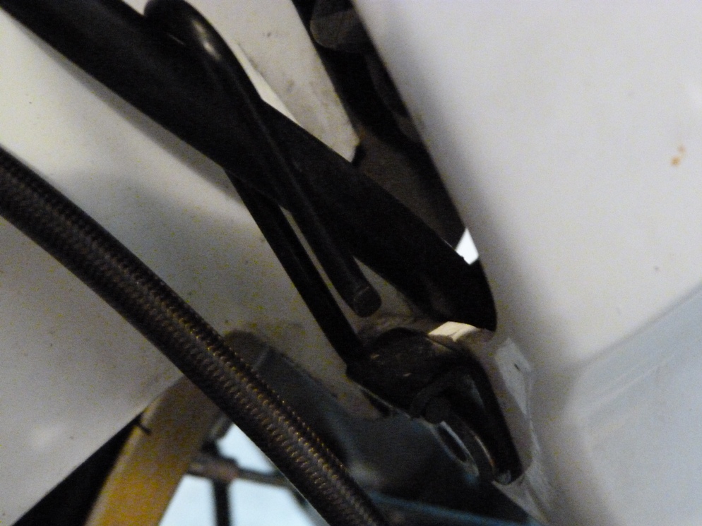 Le câble passe à l'intérieur du fourreau, passe dans le passant du GB puis monte devant le té inf dans la fenêtre du "déflecteur" 1/2 rond qui est fixé sous le té.