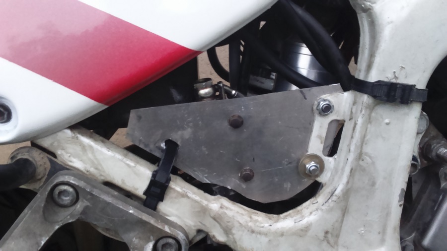 Après avoir changé le piston et autre pièce de mon étrier (thanks Denis pour la commande groupée et la seringue :) §dibong ), bah rien à faire, j'arrive pas à faire la purge avec le MC de CRF. Je sais pas si je m'y suis mal pris, si le MC a recu ou si l'étrier à morflé aussi, du coup j'ai tout changé et mis un MC de RD04. 1 Semaine que j'étais dessus, j'commençais à en avoir légèrement marre (et madame aussi comme je m'occupais + de la moto ^^). Du coup me suis fait un petit support pour décaler le MC, car celui d'origine vient me taper la bonbonne de mon amorto ( WP de KTM 640 ou 690, sais plus). C'est provisoire car mon joaillier personnel me fera un MC de la mort-ki-tue :D