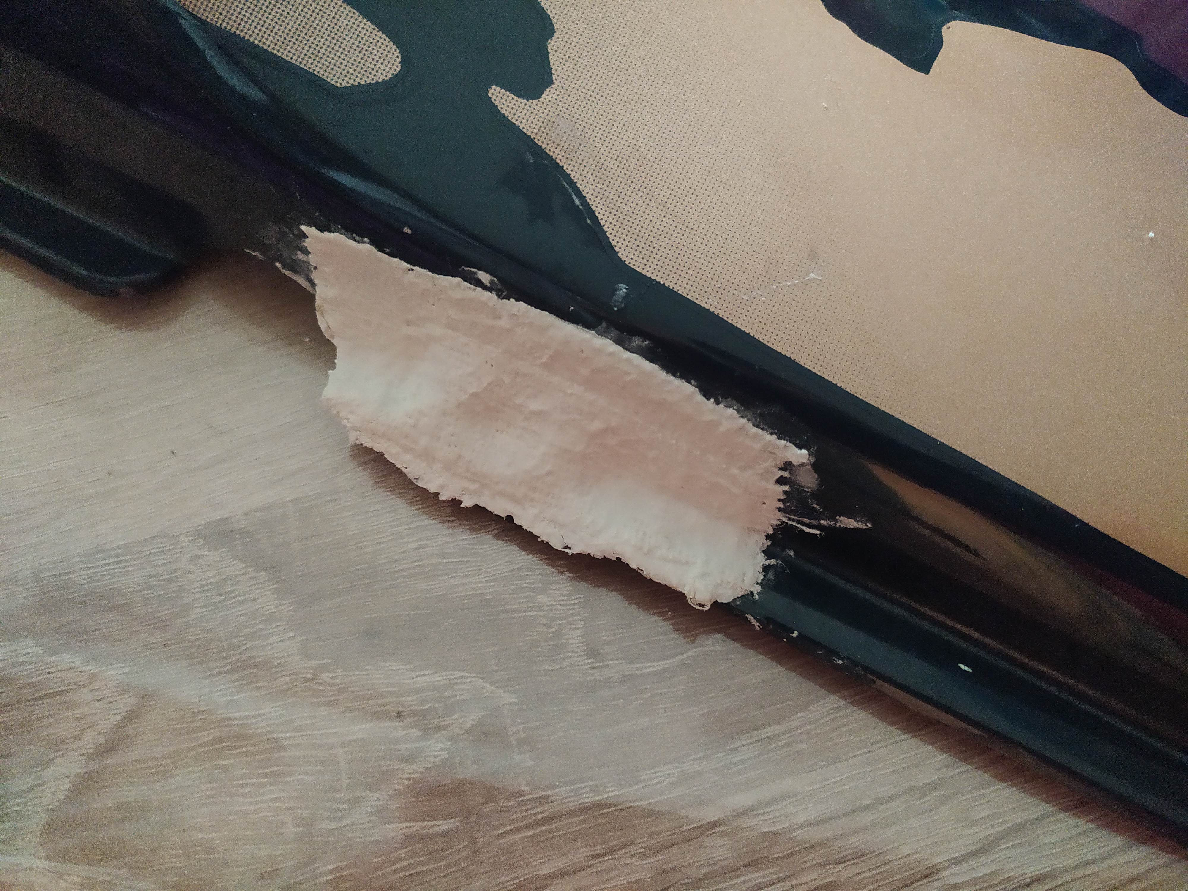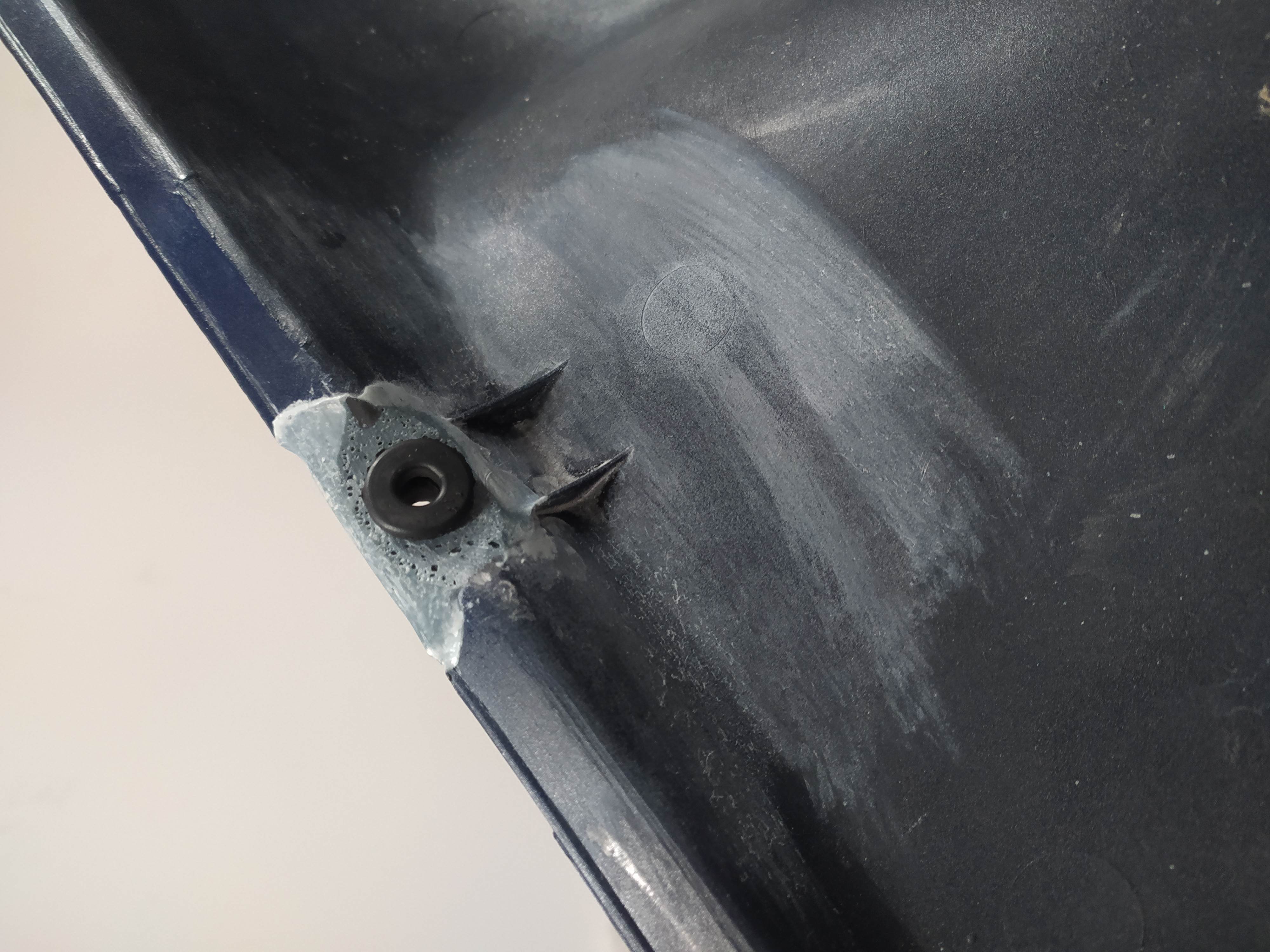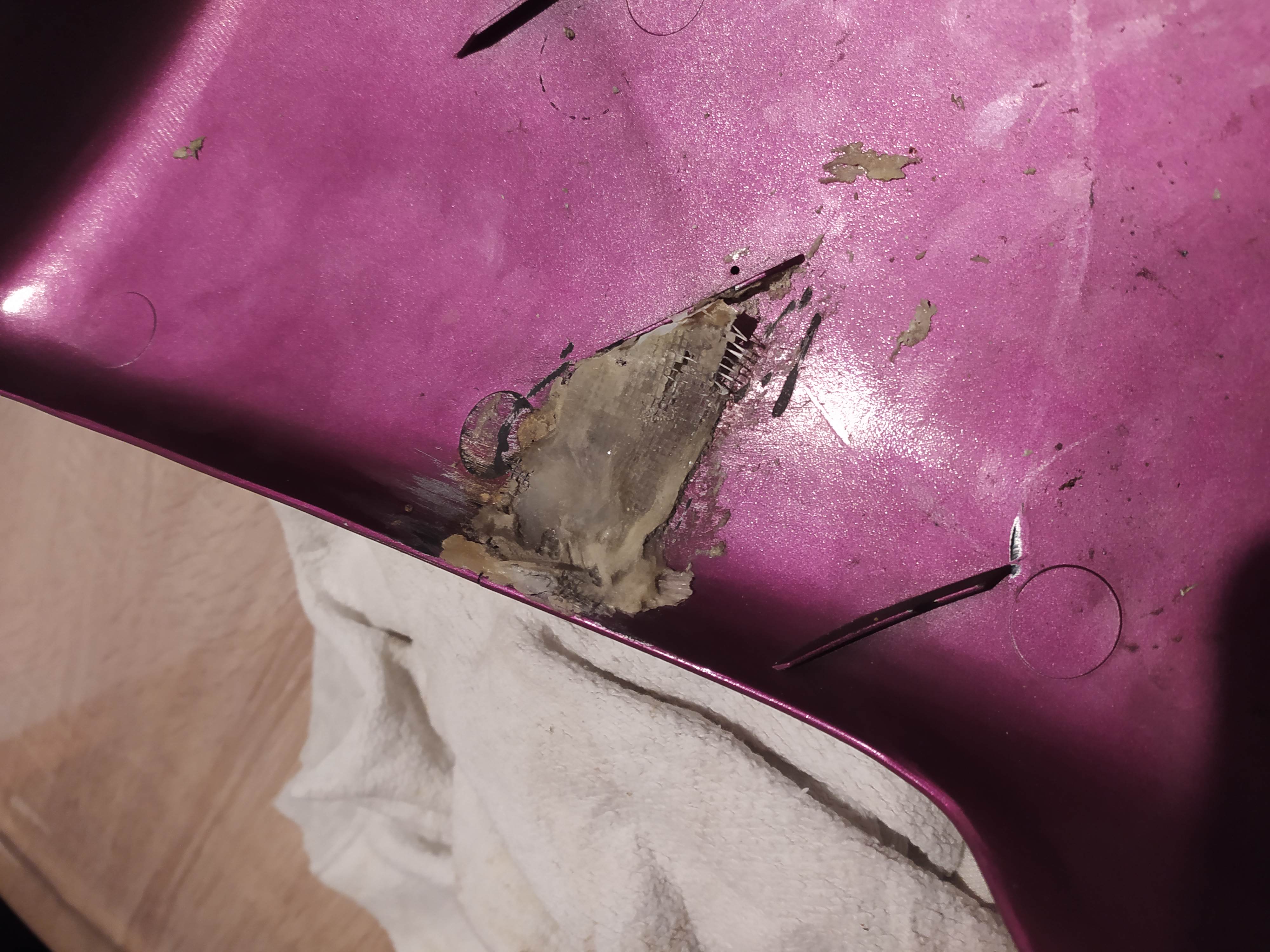 Sur le carénage avant droit, il a fallu enlever la réparation mal faite, gratter, renforcer, puis j’ai appliqué la pâte.
