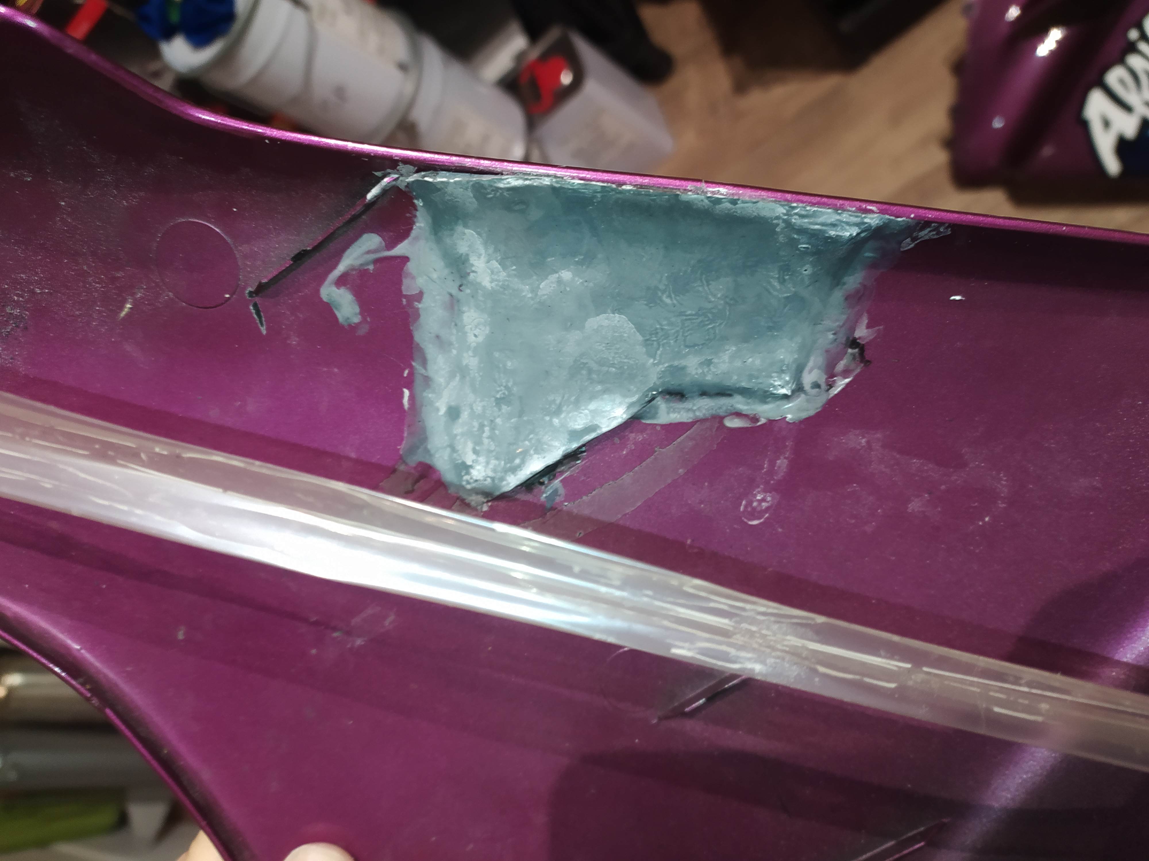Confection d’une pâte avec de l’ABS et de l’acétone. On mélange tout ça, on attend quelques jours et on obtient une colle parfaite pour réparer nos carénages.