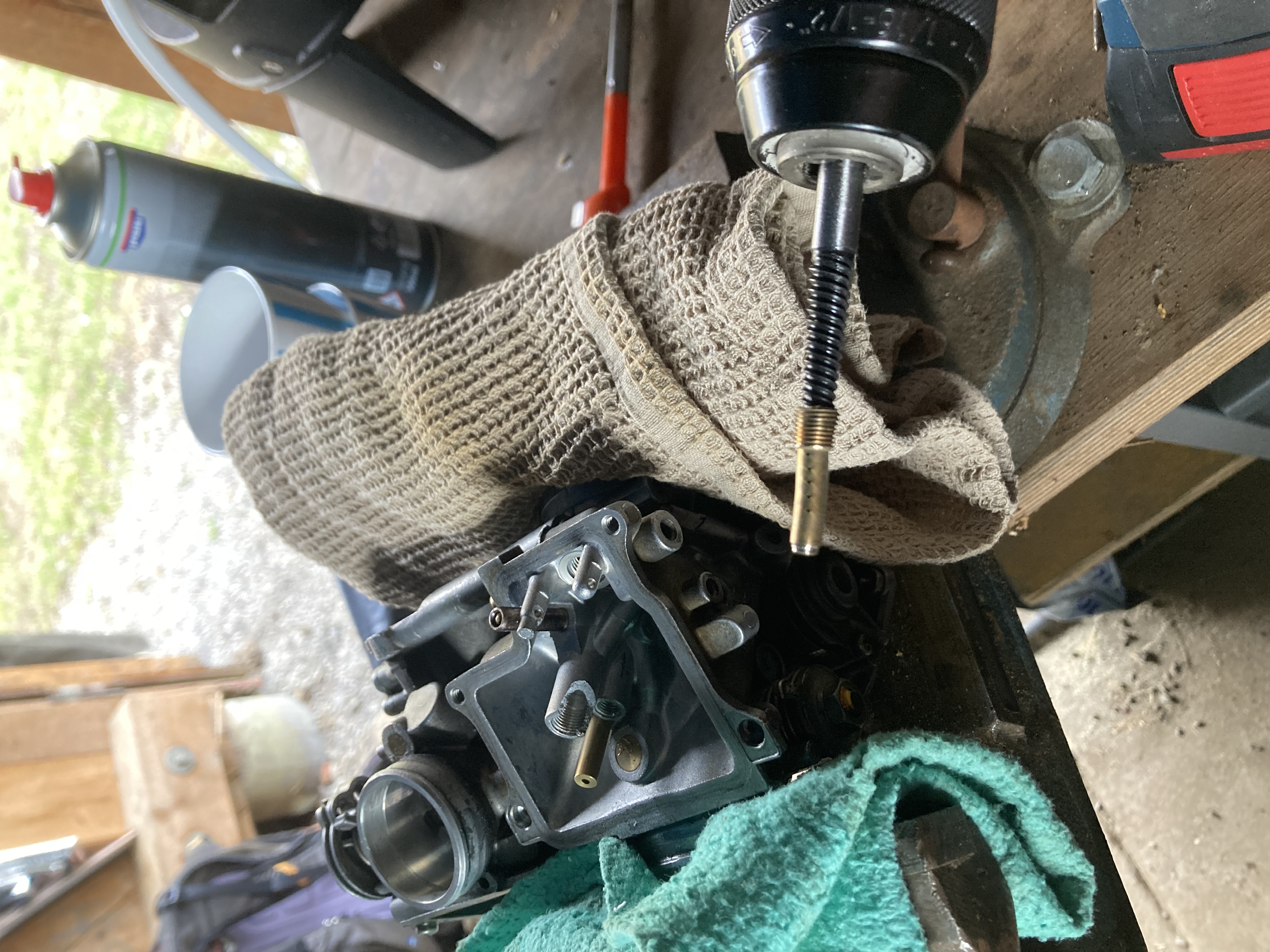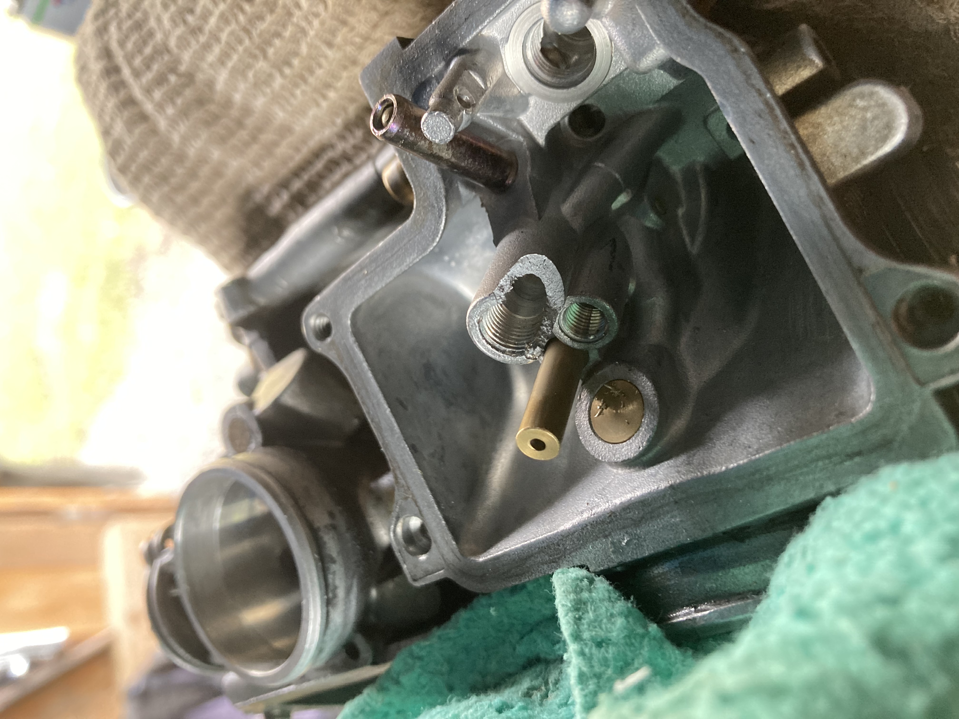 Après avoir démonté les carbus, j’ai retiré les gicleurs avec un dont la tête a cassé… (probablement trop serré par l’ancien proprio)
