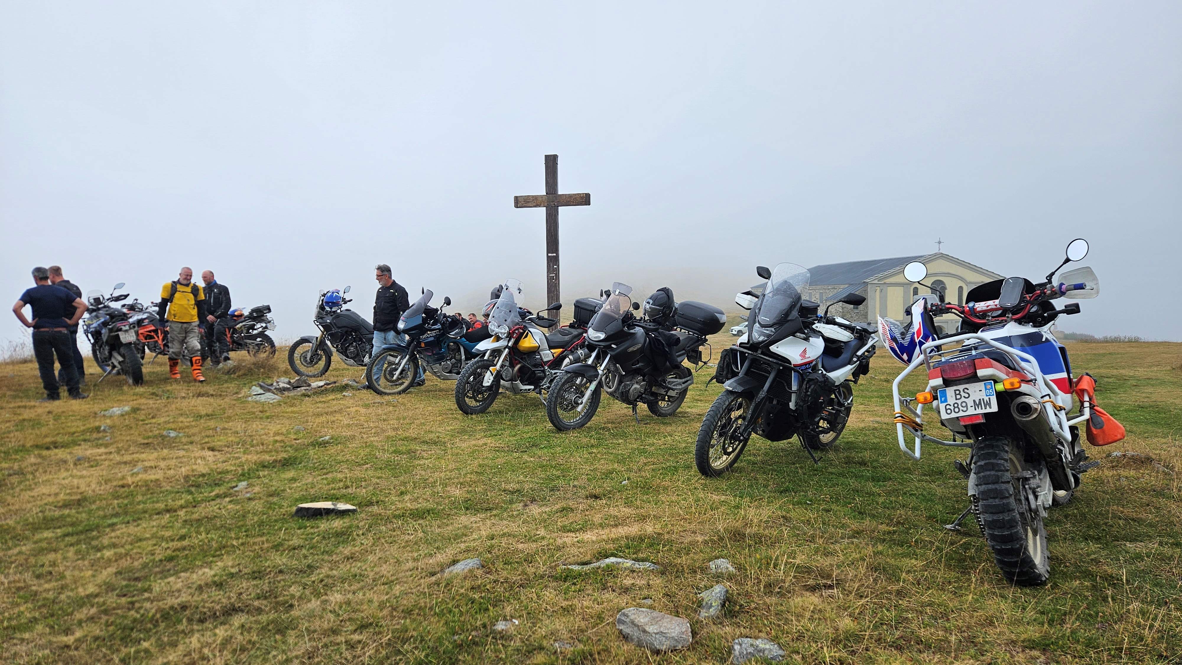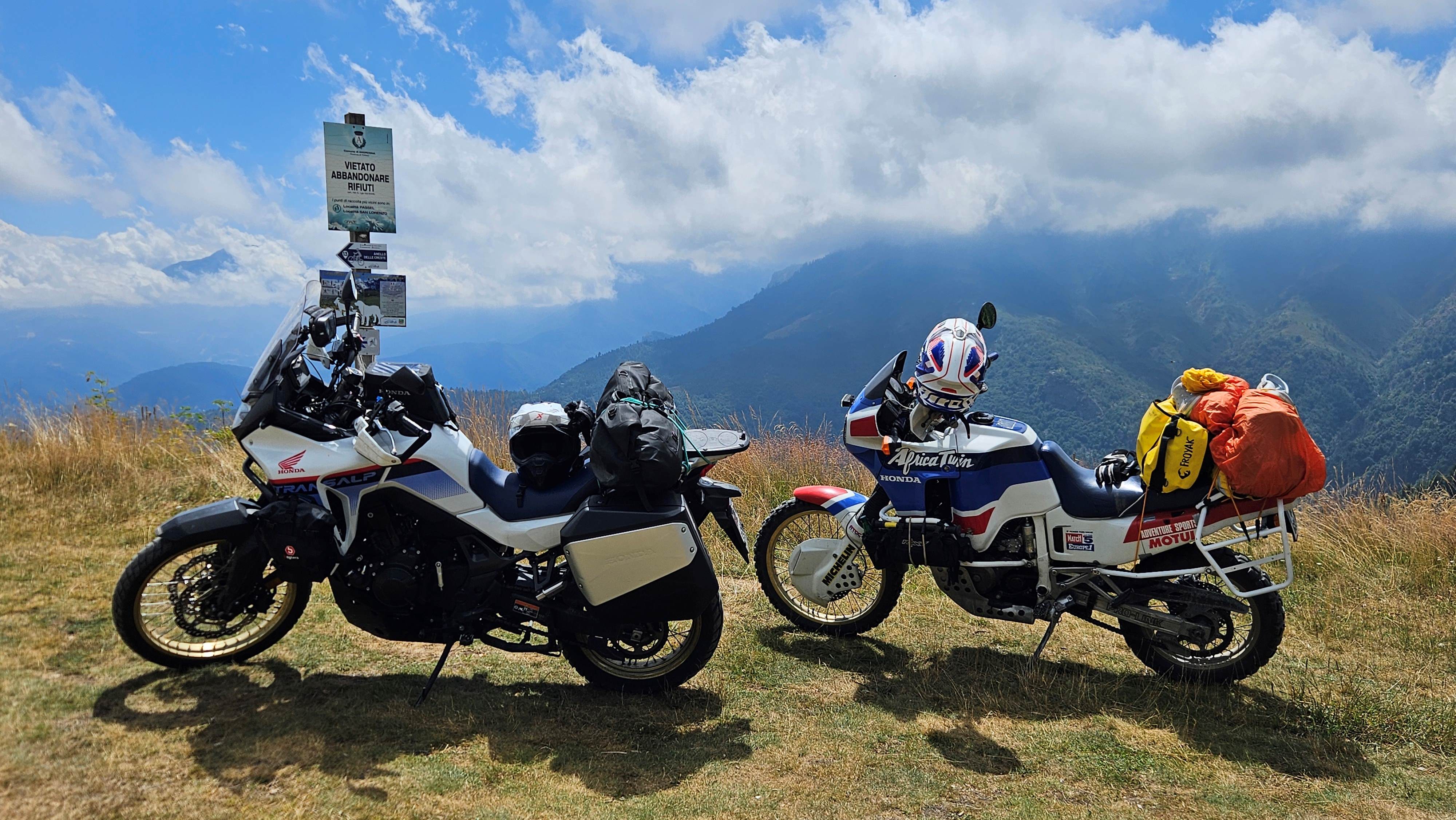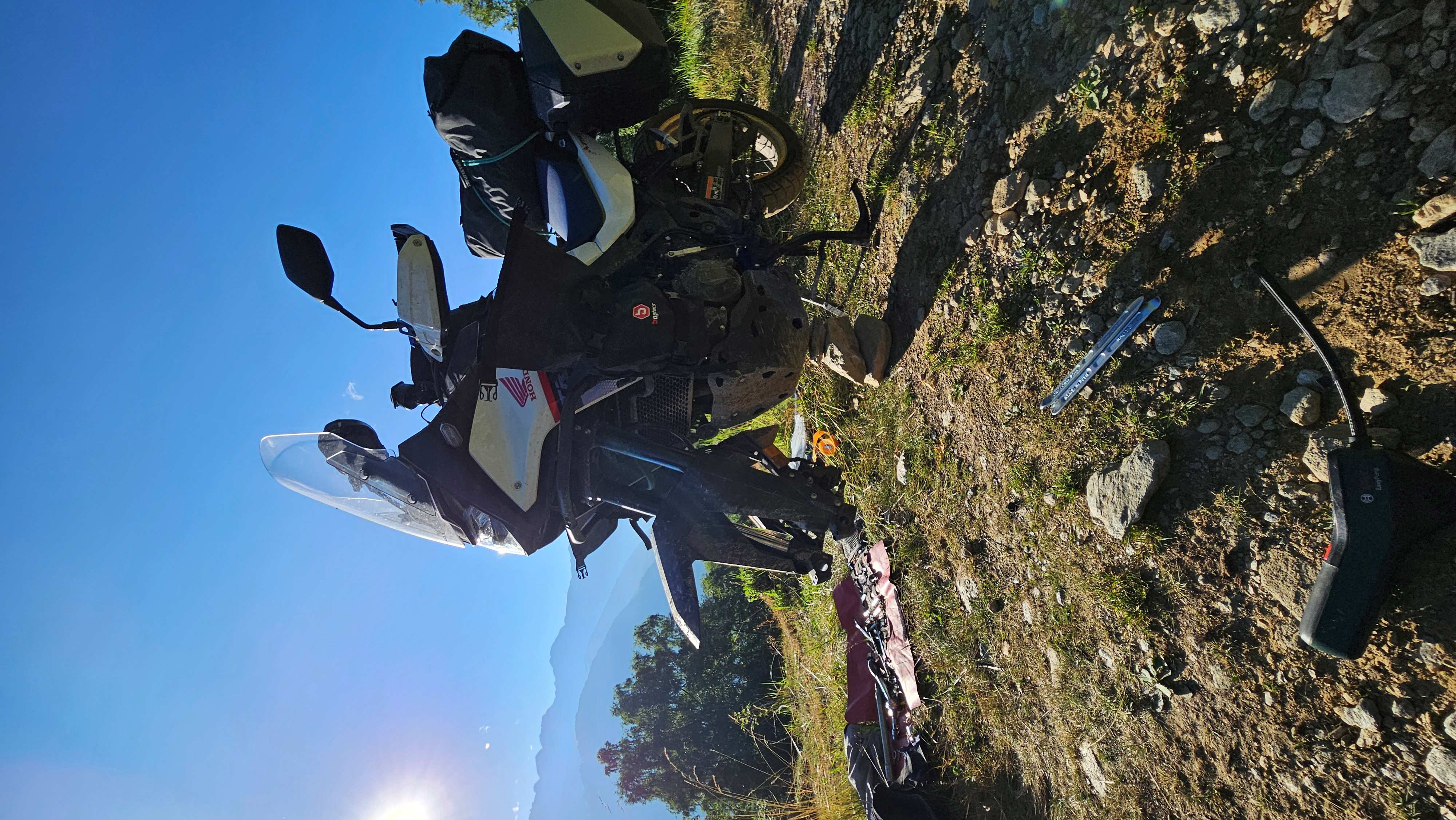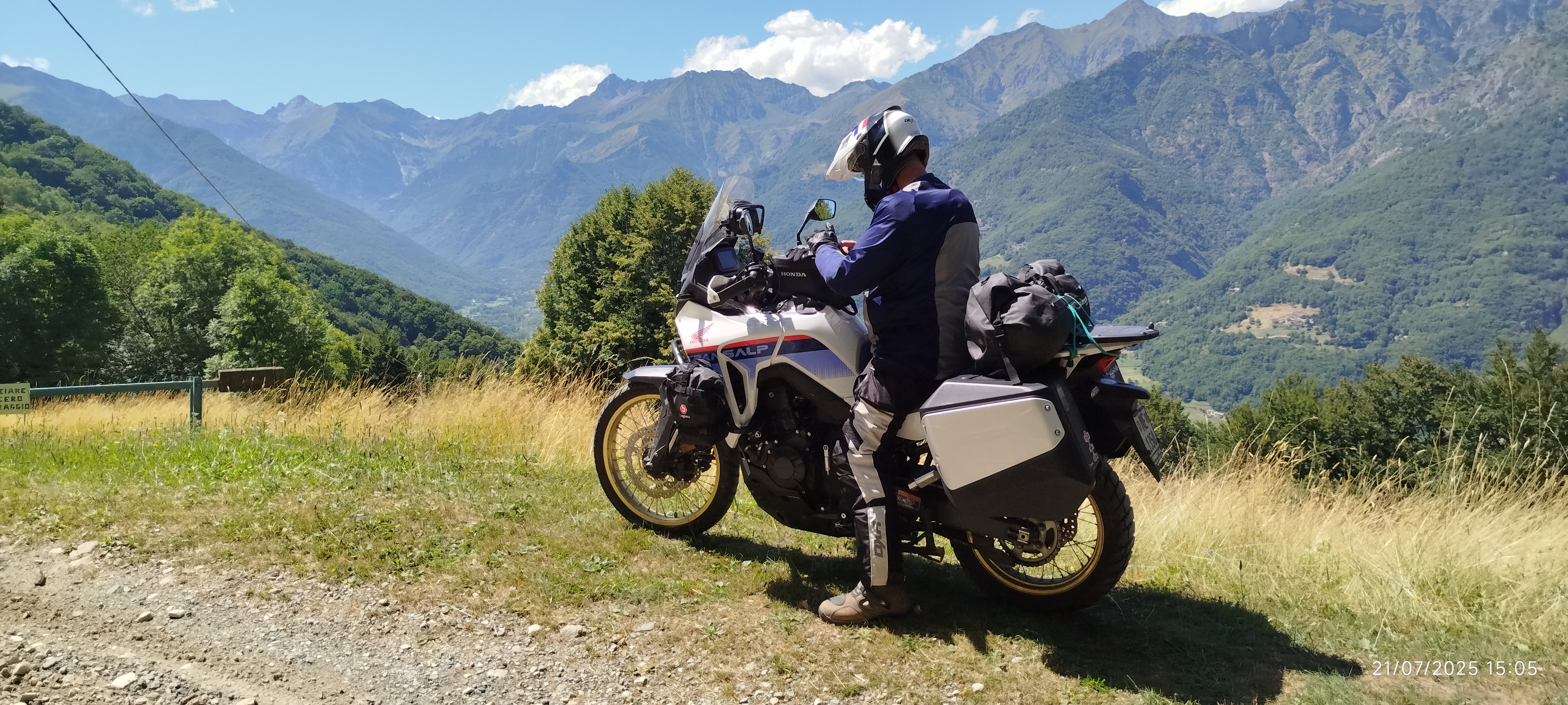 2ème jour : après avoir rangé mon barda, je démarre la moto qui part bien. Je me dis que la journée va être belle, j’ai 45’ de route pour rejoindre la piste du TET que j’avais repérée, ensuite direction Susa par les chemins pour rejoindre l’équipe de la Stella au camping Gran Bosco. Mal m’en a pris, mamie commence à chauffer dur, je ne fais pas 5’ de route qu’elle est dans le rouge… ça m’arrive 2 fois, à chaque fois j’arrête la moto pour qu’elle refroidisse. Ça ne sent pas bon et je décide d’aller dans un garage pour qu’ils me regardent tout ça, j’ai quand même une semaine de pistes et routes qui m’attend ! je repère sur Google Maps une concession Honda pas loin, à San Giorgio Canavese et m’y rend fissa. Ils me prennent de suite et le verdict tombe après 20’ : ils ont dû ajouter 2.5 lt de liquide de refroidissement dans le circuit, y’avait plus rien, le haut moteur est touché, plus de compression. En donnant les gaz il y a plein de LR qui sort de la durite de trop plein du vase d’expansion, c’est mort…