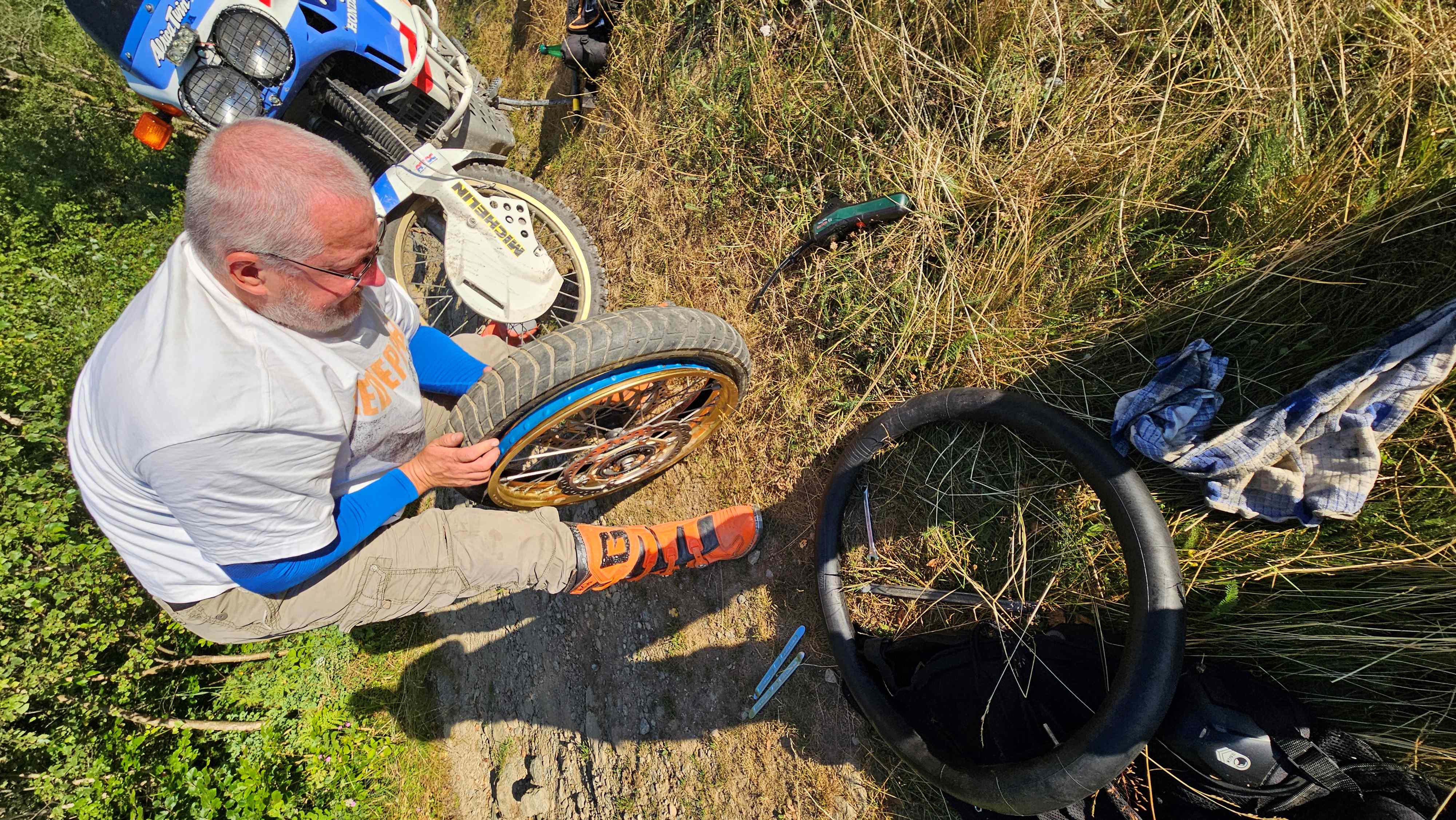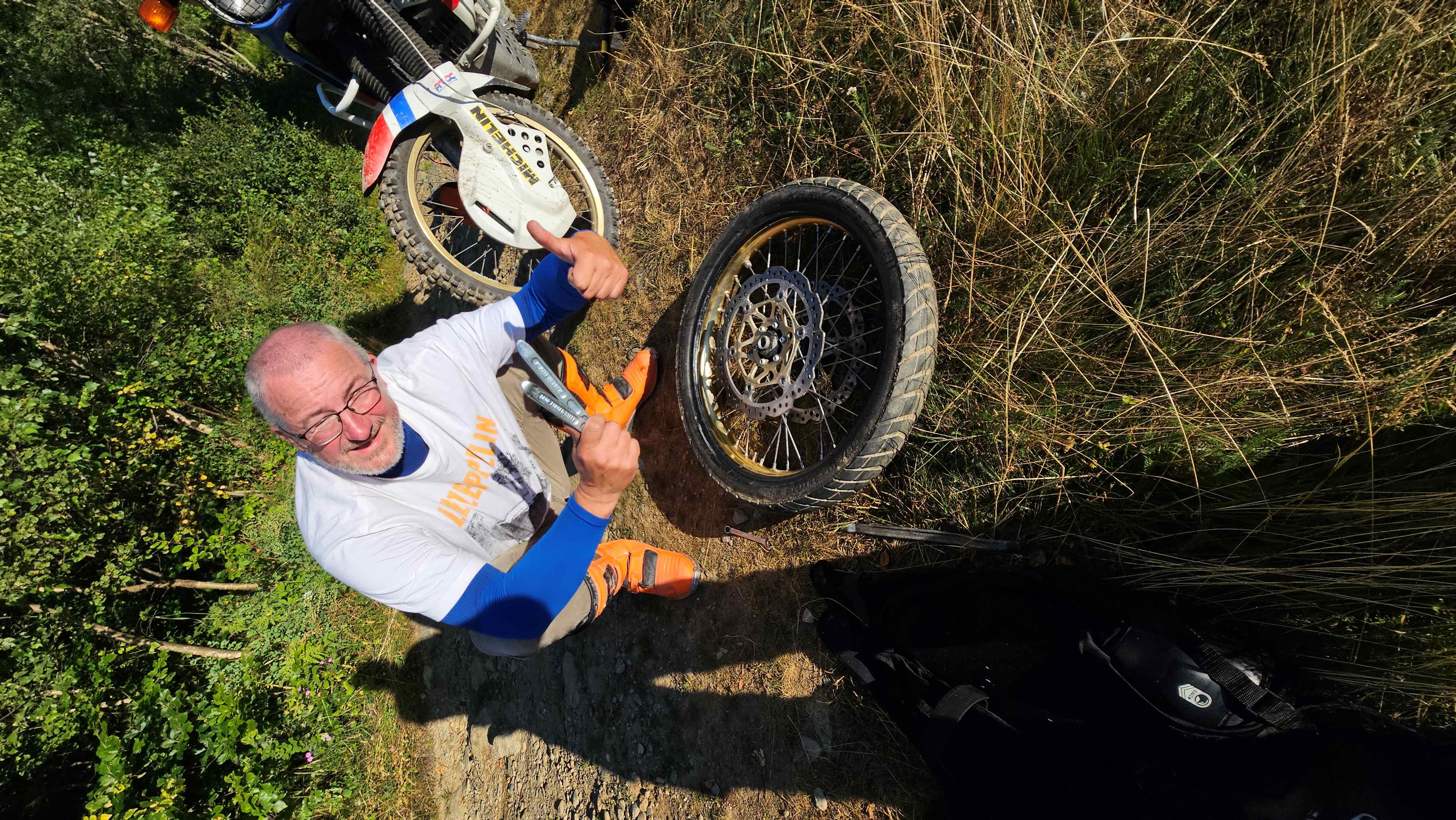 Mais ce qui devait arriver arriva : crevaison pneu AV pour moi. Le pneu trop mou s’est déjanté dans la caillasse et a pincé la chambre à air, moto ingouvernable donc chute. Rien de grave mais il fallait réparer…