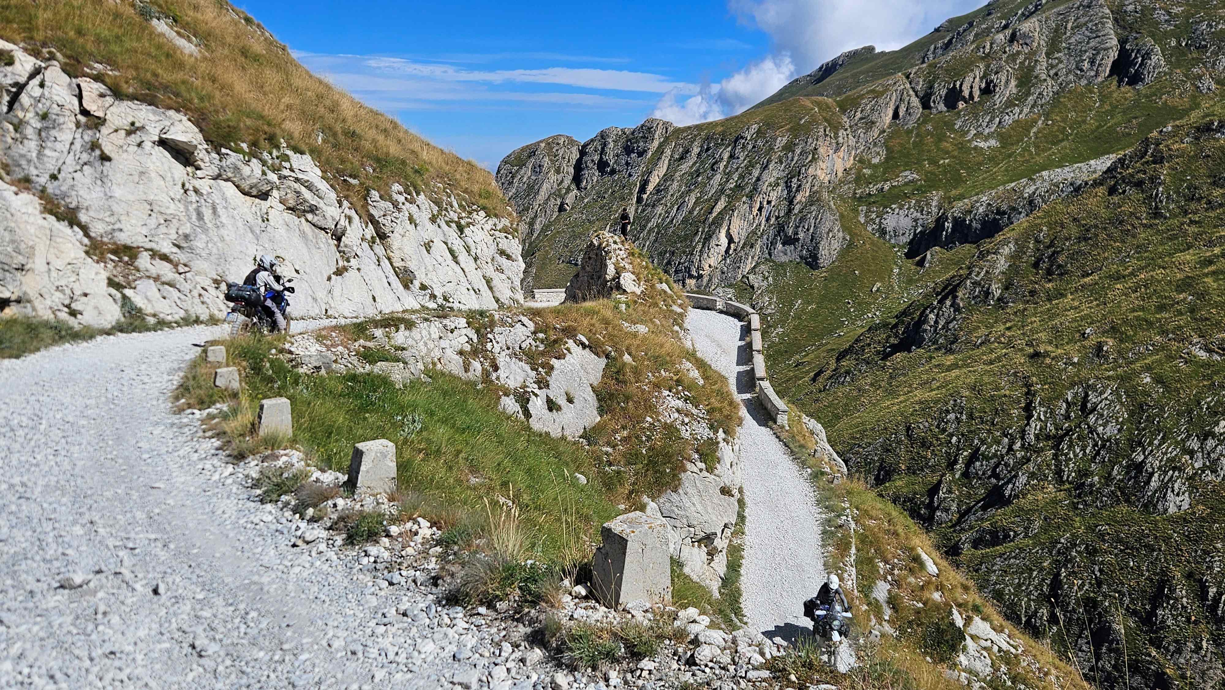 Arrivé au Colle Valcavera, on peut soit tourner à droite pour aller voir le monument dédié à Marco Pantani et redescendre sur bitume de l’autre côté, soit prendre la trace que donne le TET en partant sur la gauche, ce que je fis. C’est bien le début de la Maira Stura, mais arrivé au Colle Cologna, une jolie chaîne barre la route ; dommage, cette route facile était fort sympathique ! donc demi-tour et je prend la route à flanc de falaise pour aller voir la fameuse statue.