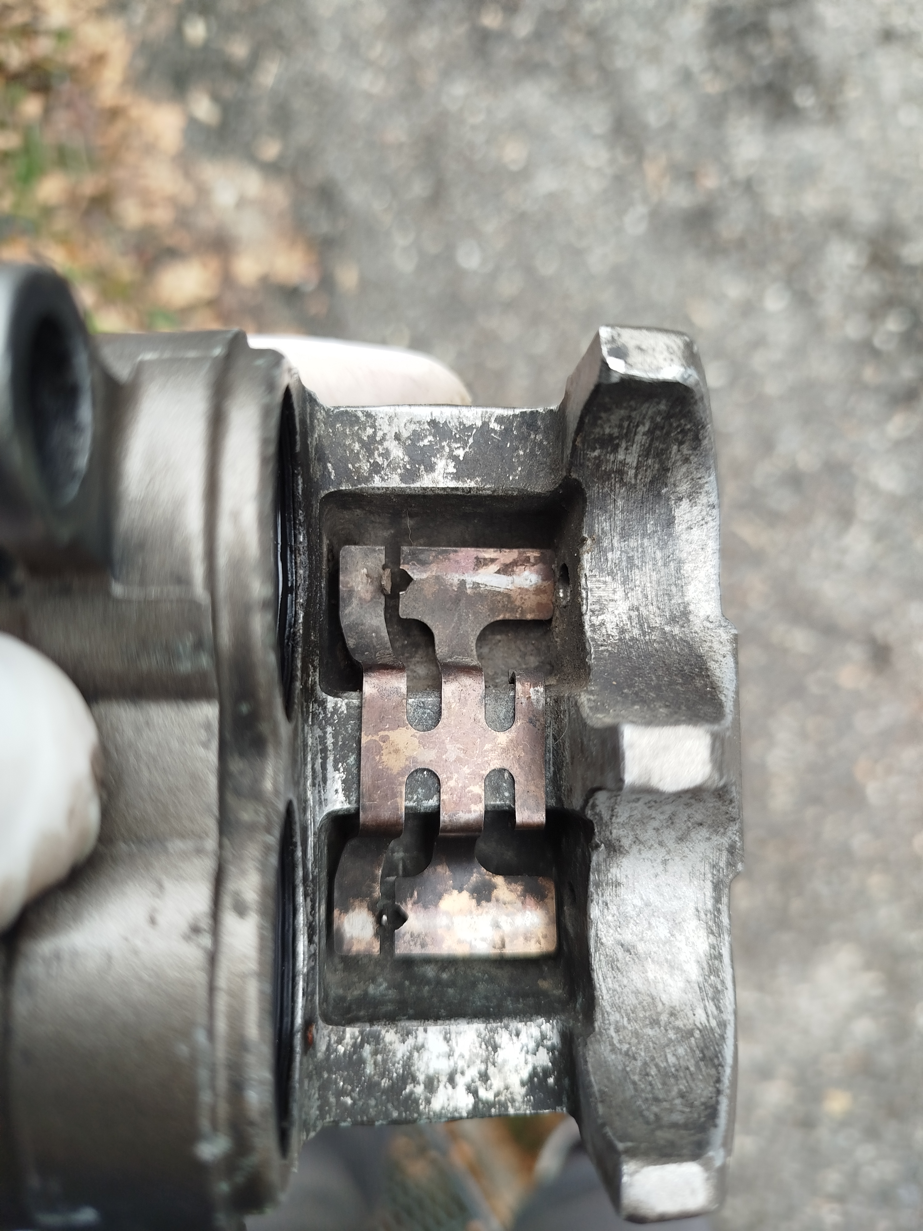 Salut ... il me semble que sur les photos des étriers de frein qui précédant la cale qui est présente au fond de l’étrier n'est pas montée correctement ... je pense qu;il faut en fait lui faire faire 180° .. les petits ergot qui remontent vers le hauts doivent se trouver coté plaquettes non poussée ...