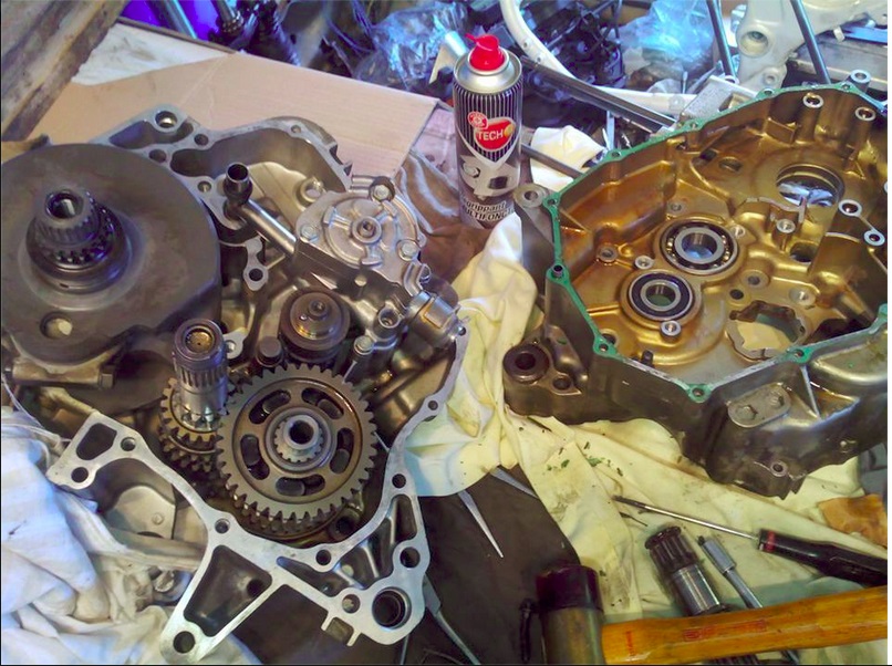 Pas évident, et pas beaucoup de place si on à pas enlevé le vilebrequin. Petite astuce : monter les arbres entre eux avant, mettre le dernier pignon de l'arbre primaire sur son roulement, et placer les arbres en tenant leur plus gros pignon. J'pense que j'ai eu de la chance car c'est rentré tout seul