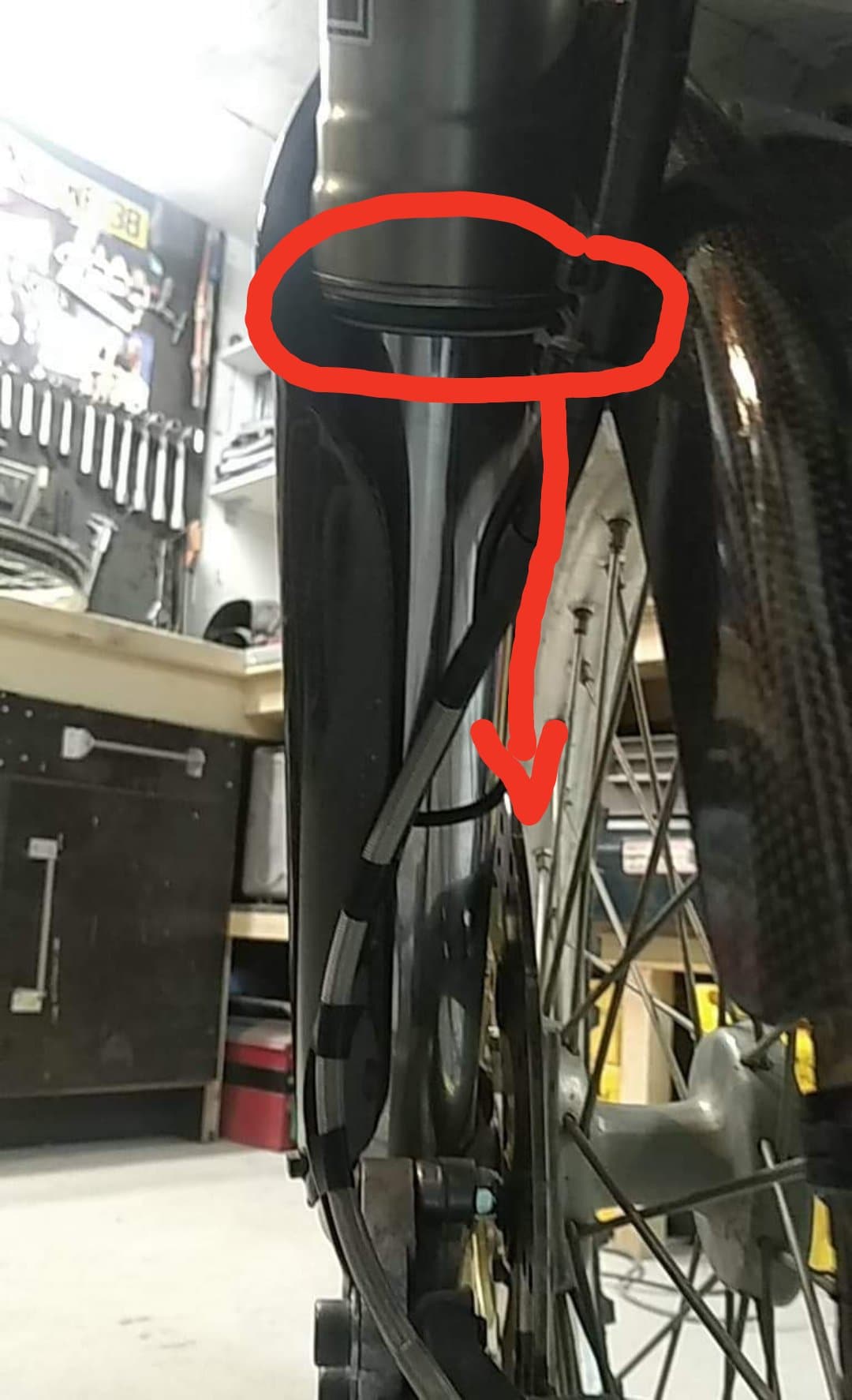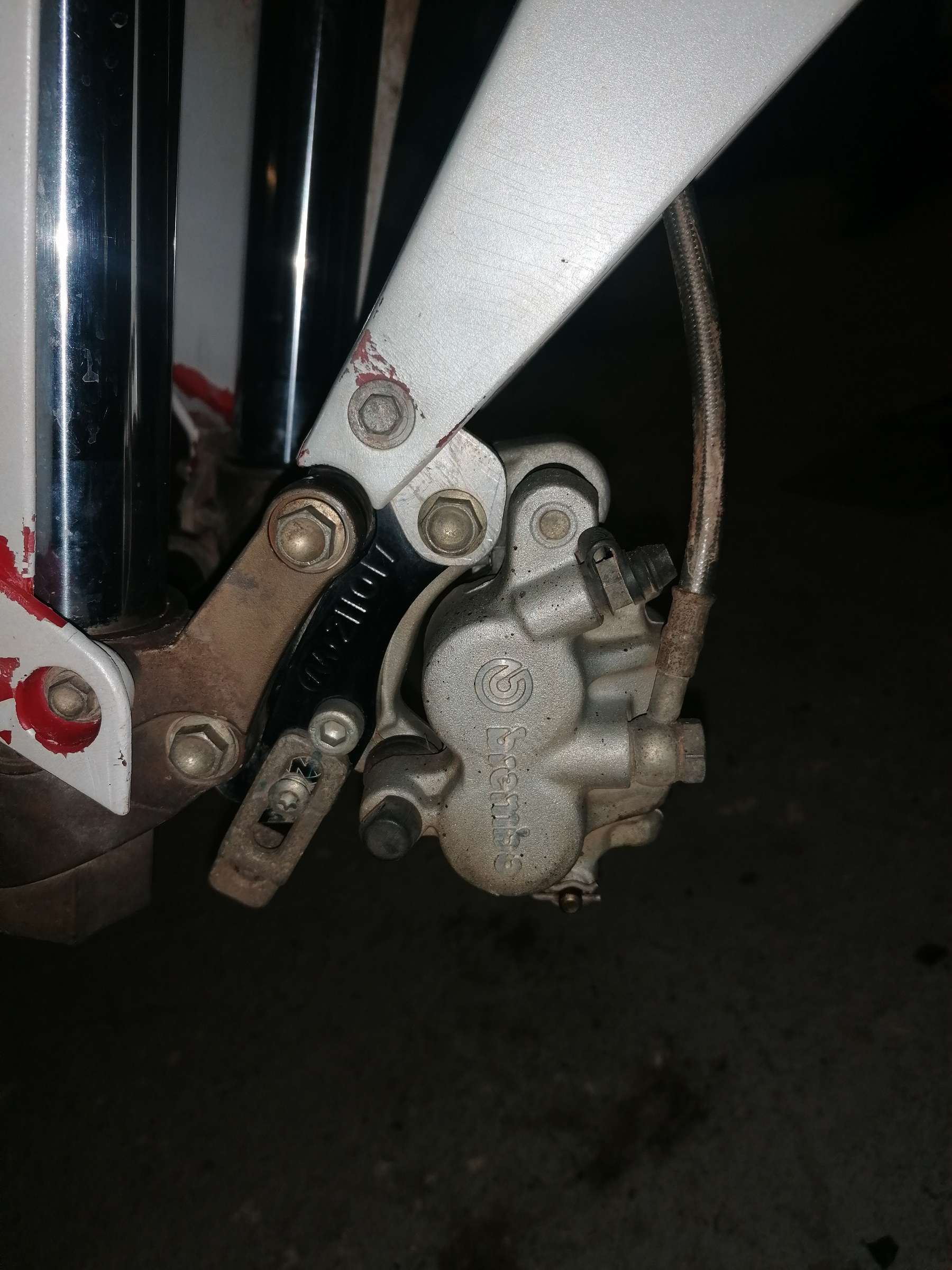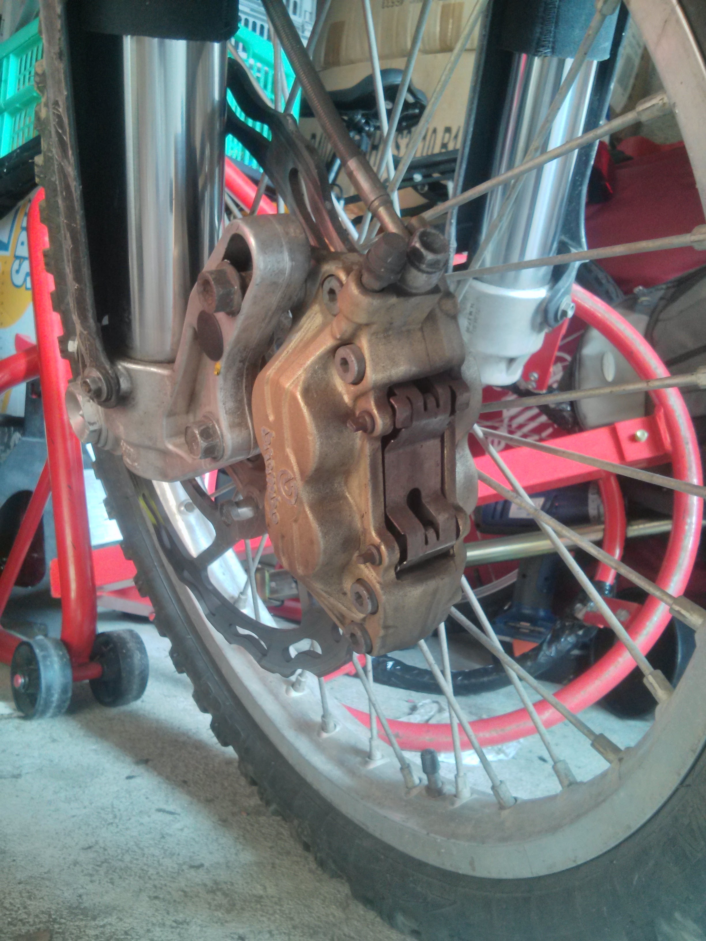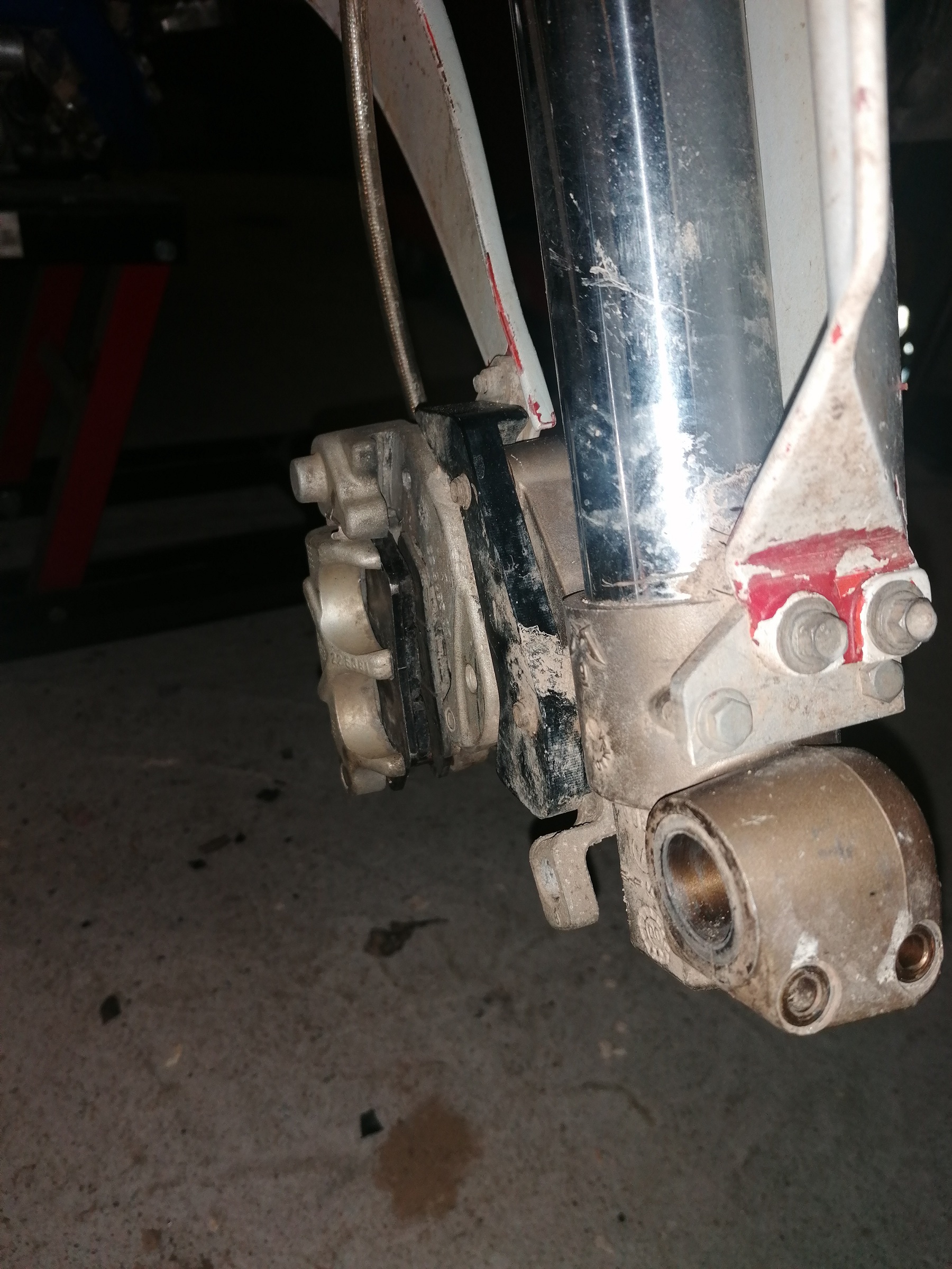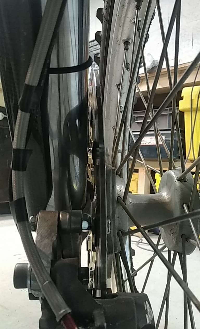j ai du poncer le cul de l étrier ensuite déporté le disque et au final l espace entre le disque et le tube de fourche est trop étroit du coup sur une grosse compression je pense que tout explose