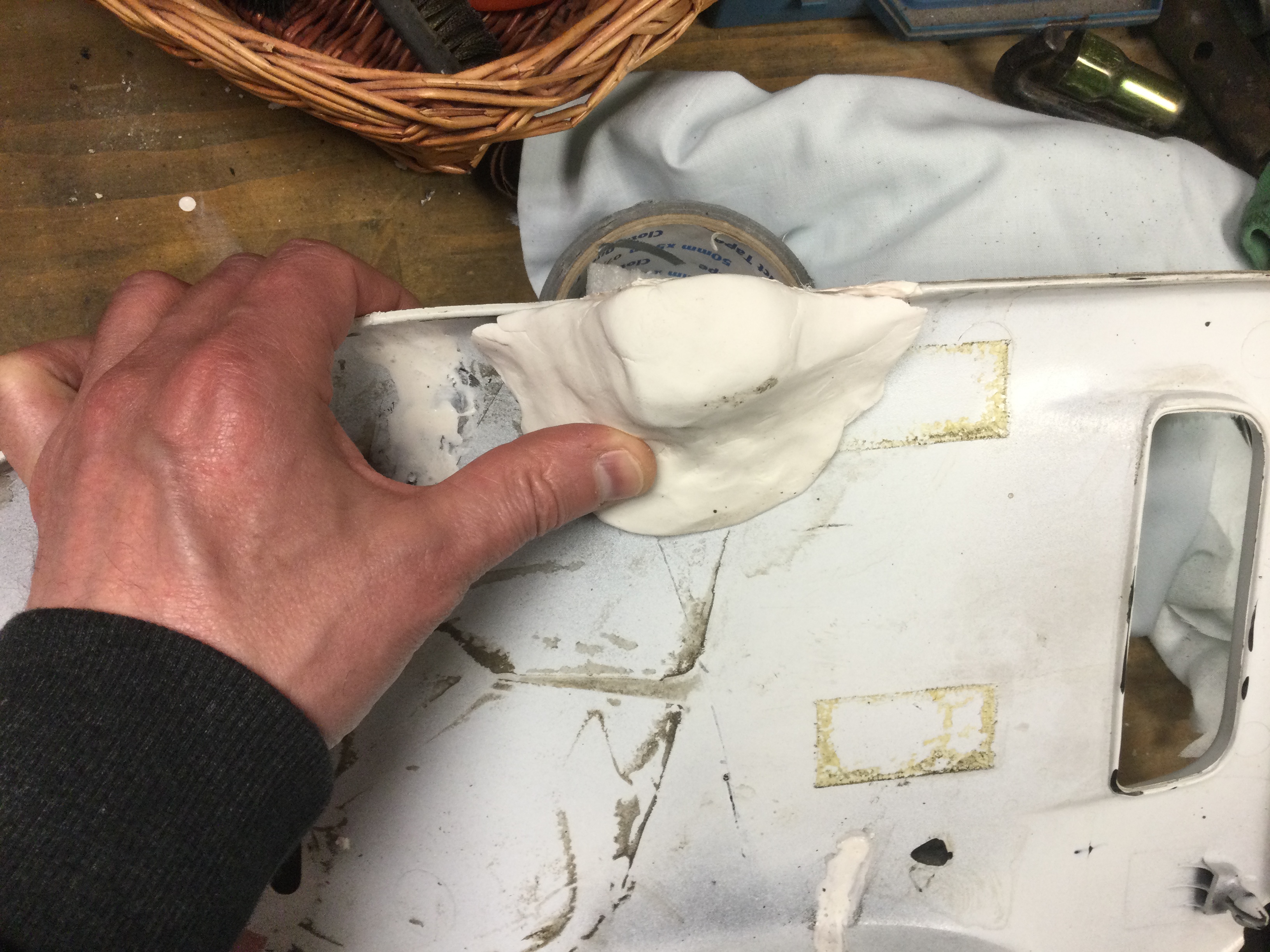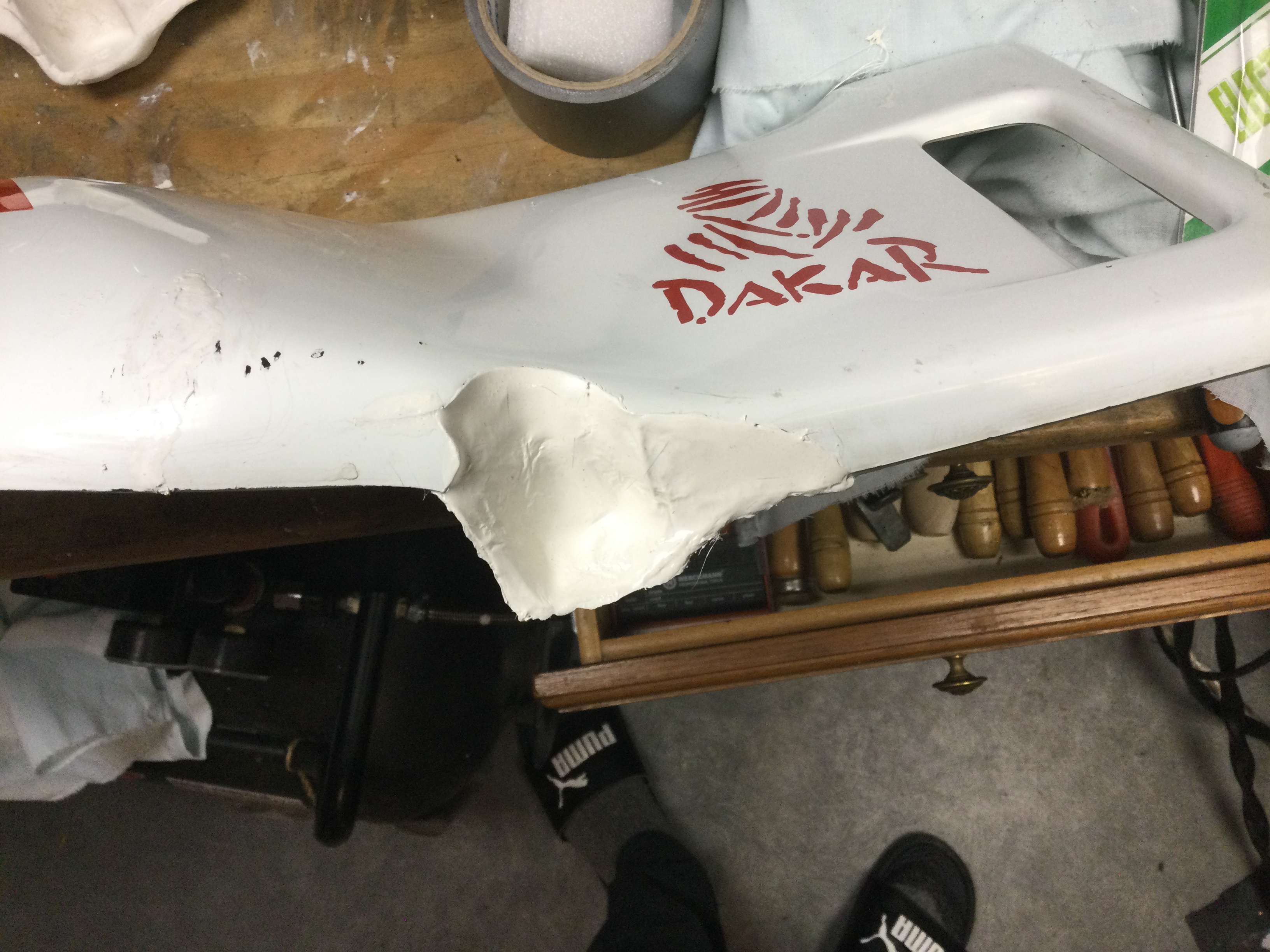 J’ai fait un moule avec de la pâte à modeler qui durcit et j’ai coulé de l’ABS dedans. Reste à charger encore par couches pour obtenir suffisamment d’épaisseur. Ensuite ça sera ponçage, mastic et peinture. On verra bien le but étant de récupérer l’attache du carénage...