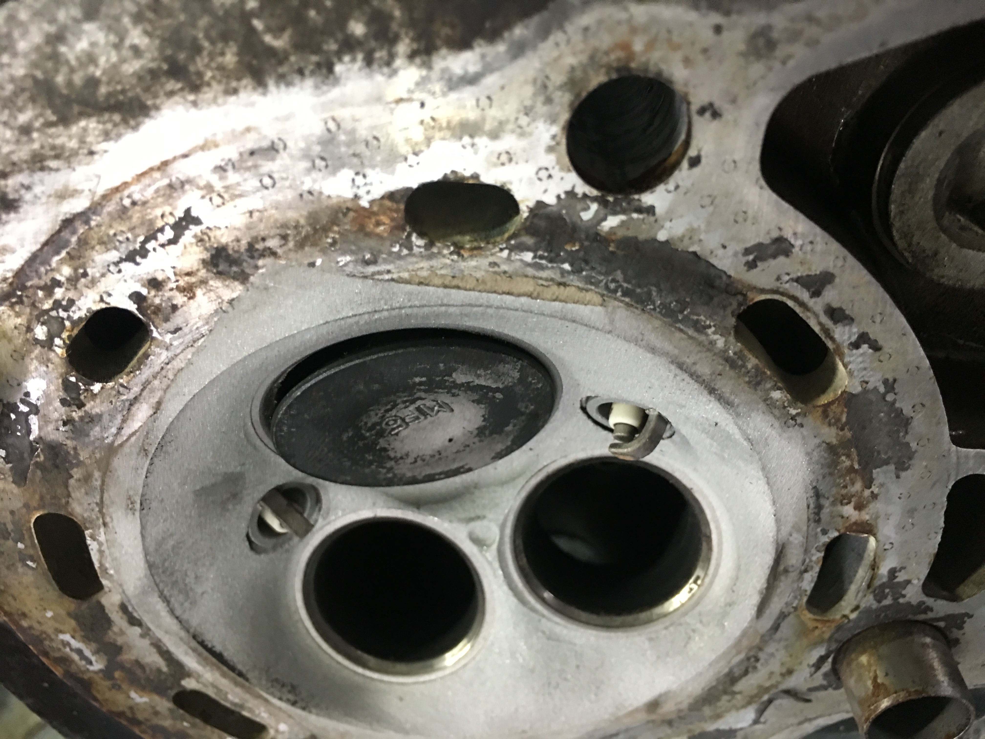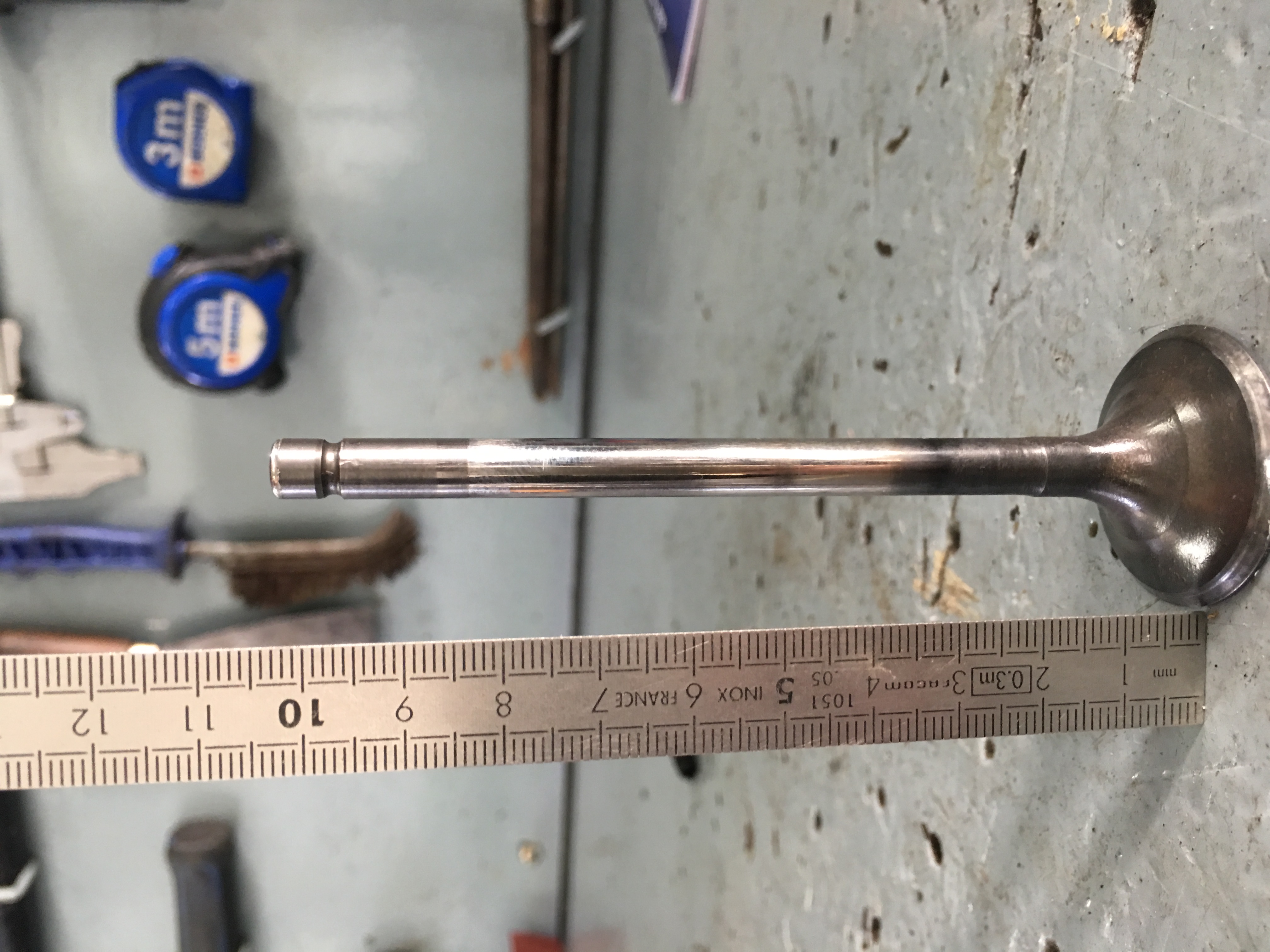 Aujourd’hui j’ai attaqué le cylindre avant et j’ai commencé par retirer les soupapes, et là, mauvaise surprise, la soupape d’échappement est pliée