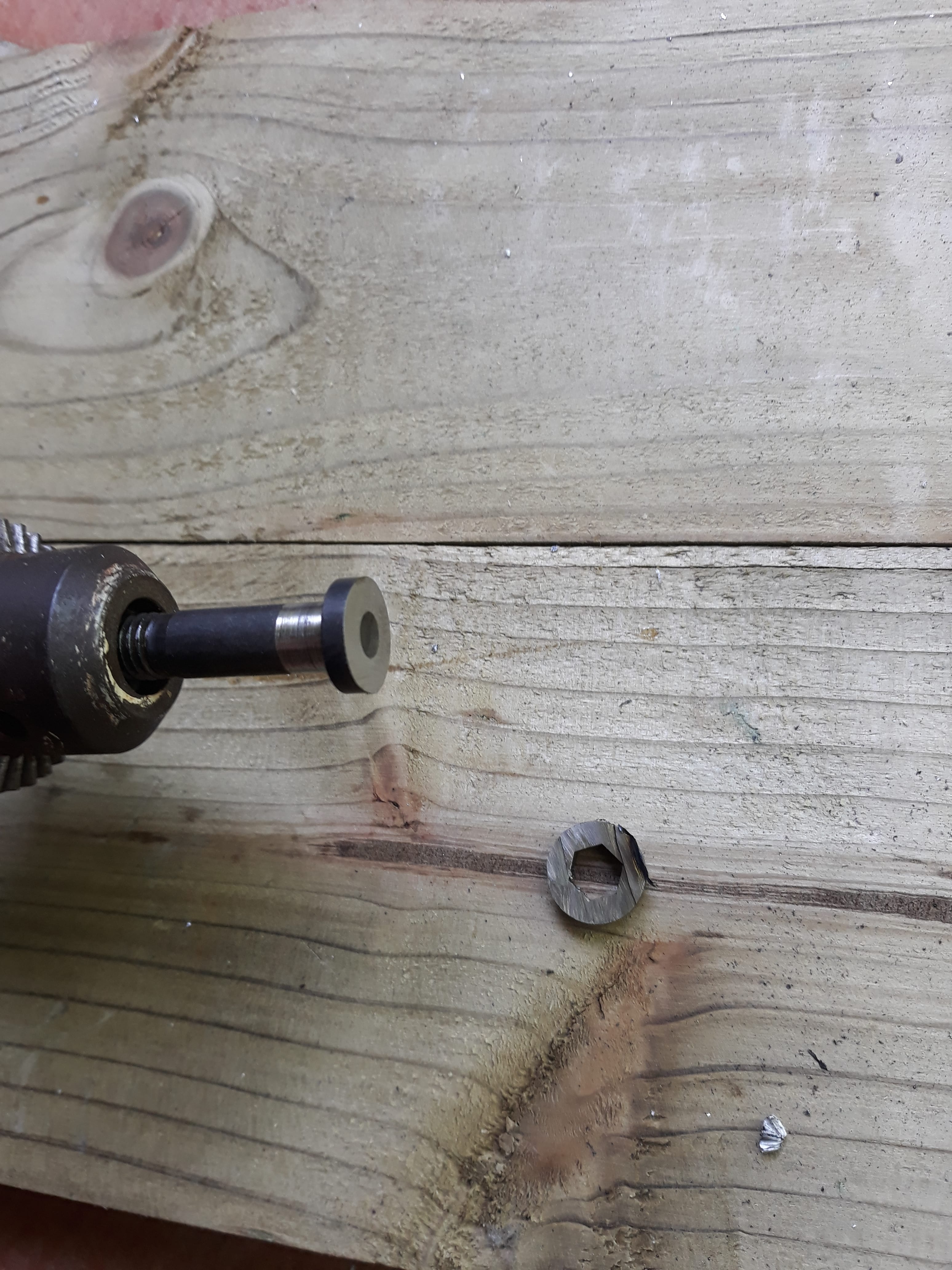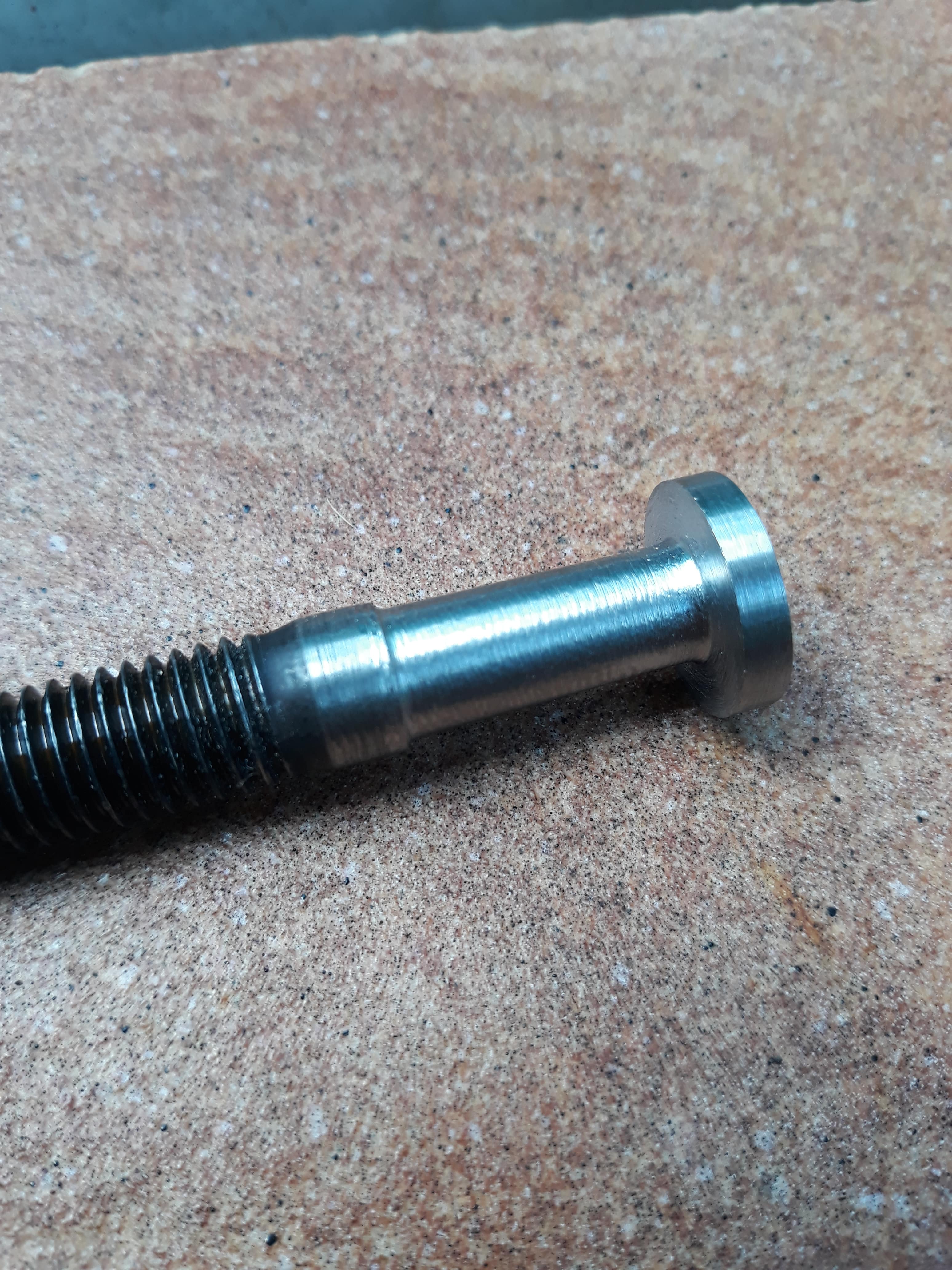 j'ai donc coupé la tête de vis propre à la meuleuse, ensuite je mets la vis sur la perceuse et je réduis le diamètre de la tige à la lime, puis petites finitions meuleuse et toile emeri...