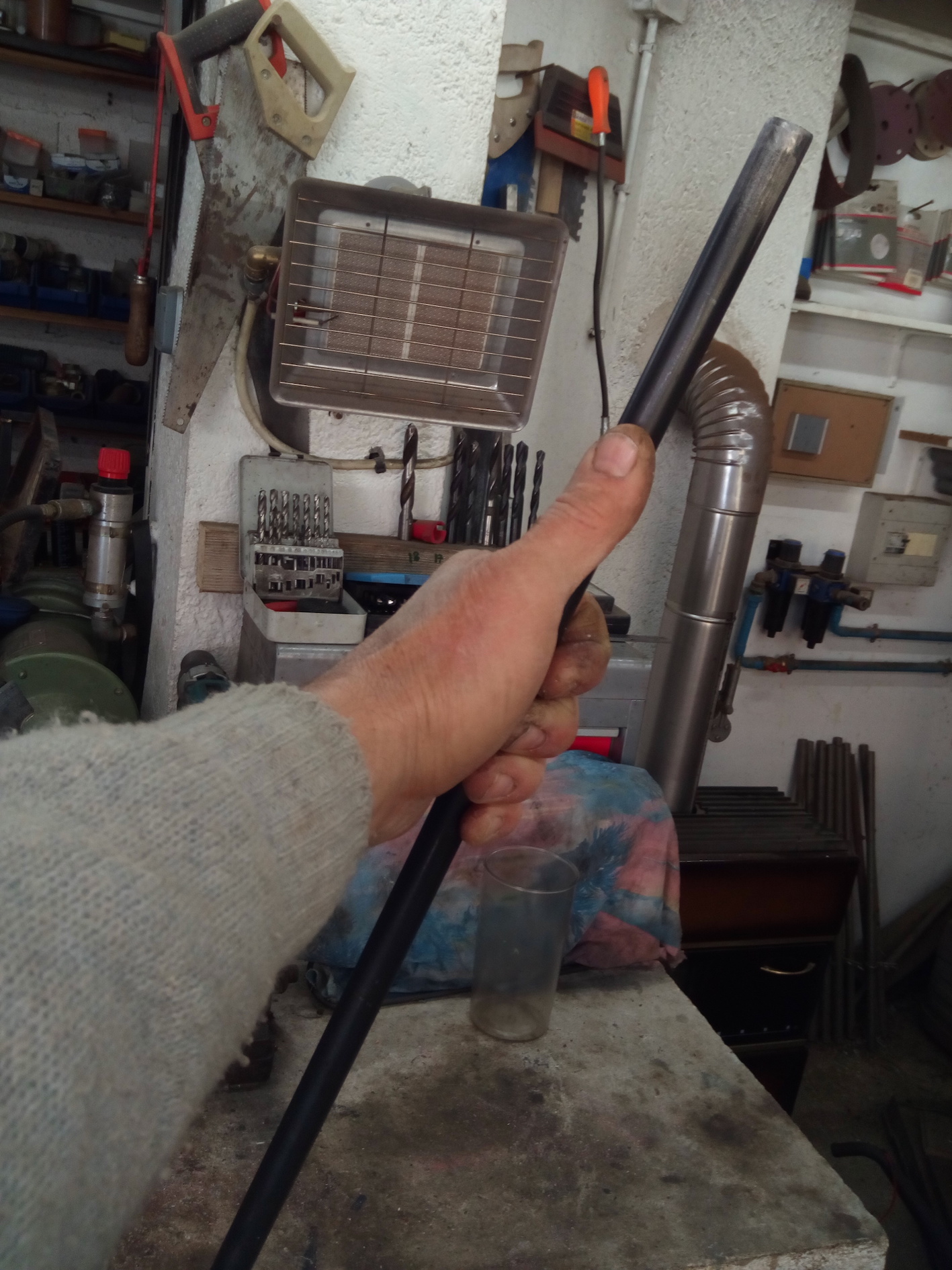 Cette pipe est creuse.Il suffit de prendre un fer rond plein (ça doit marcher avec une tige filetée) de diamètre plus gros ,