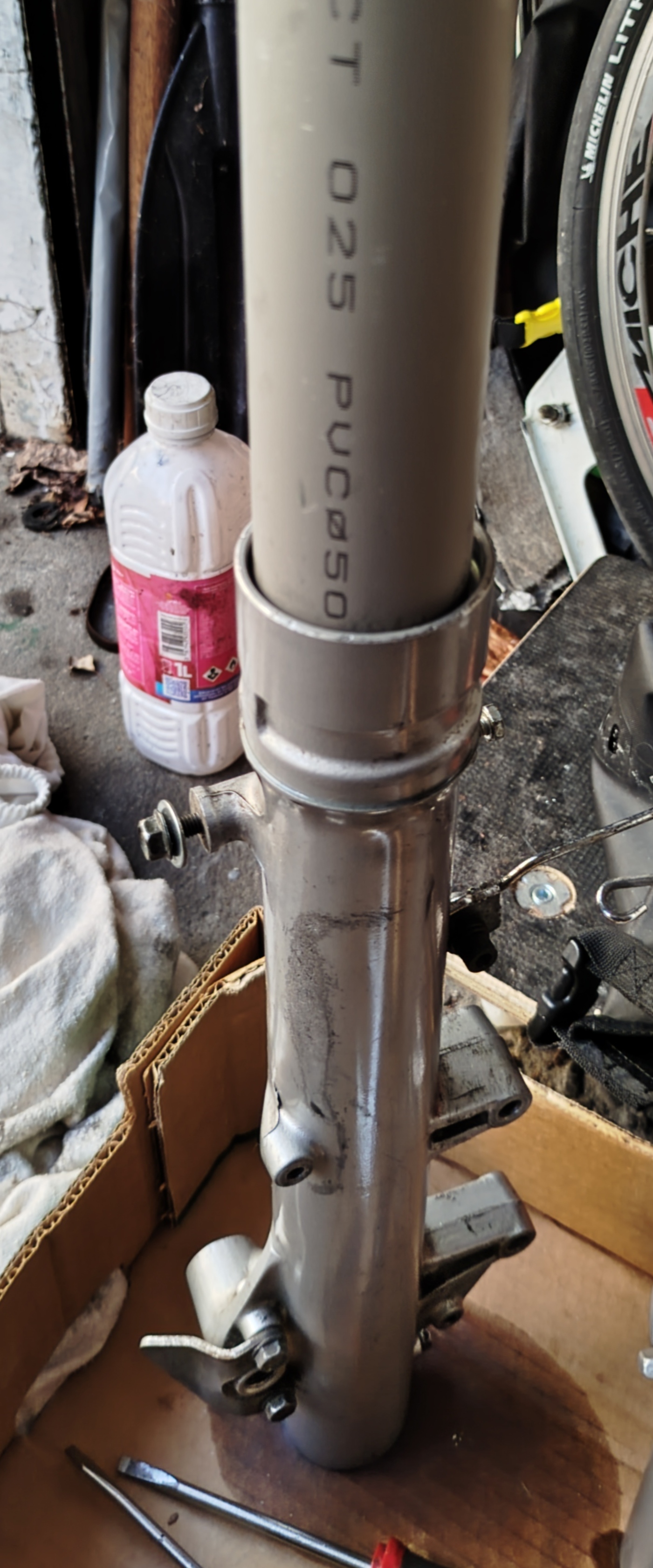 Donc je redémonte, mais maintenant je suis emmer... par la vis BTR du fond de fourche qui tient le tube plongeur. Elle est bloquée et ça tourne dans le vide. J'ai remis les ressorts, et le bouchon du haut, rien n'y fait pour la débloquer.