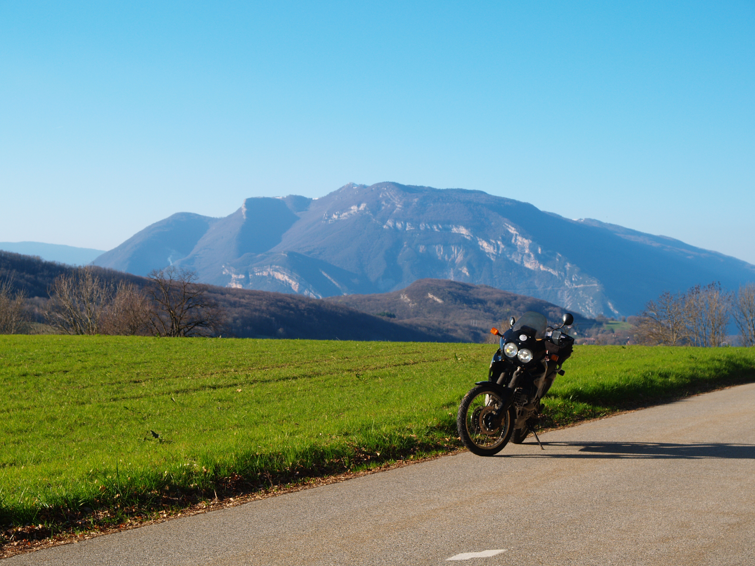 En tenue d'été parce qu'il faisait beau et c'était pour faire 20 bornes avec ma bouse de 2003... pis je ne sais pas ce qui s'est passé, 2 heures après je me suis retrouvé dans la montagne sur les pentes de la dent du chat avec des primevères partout