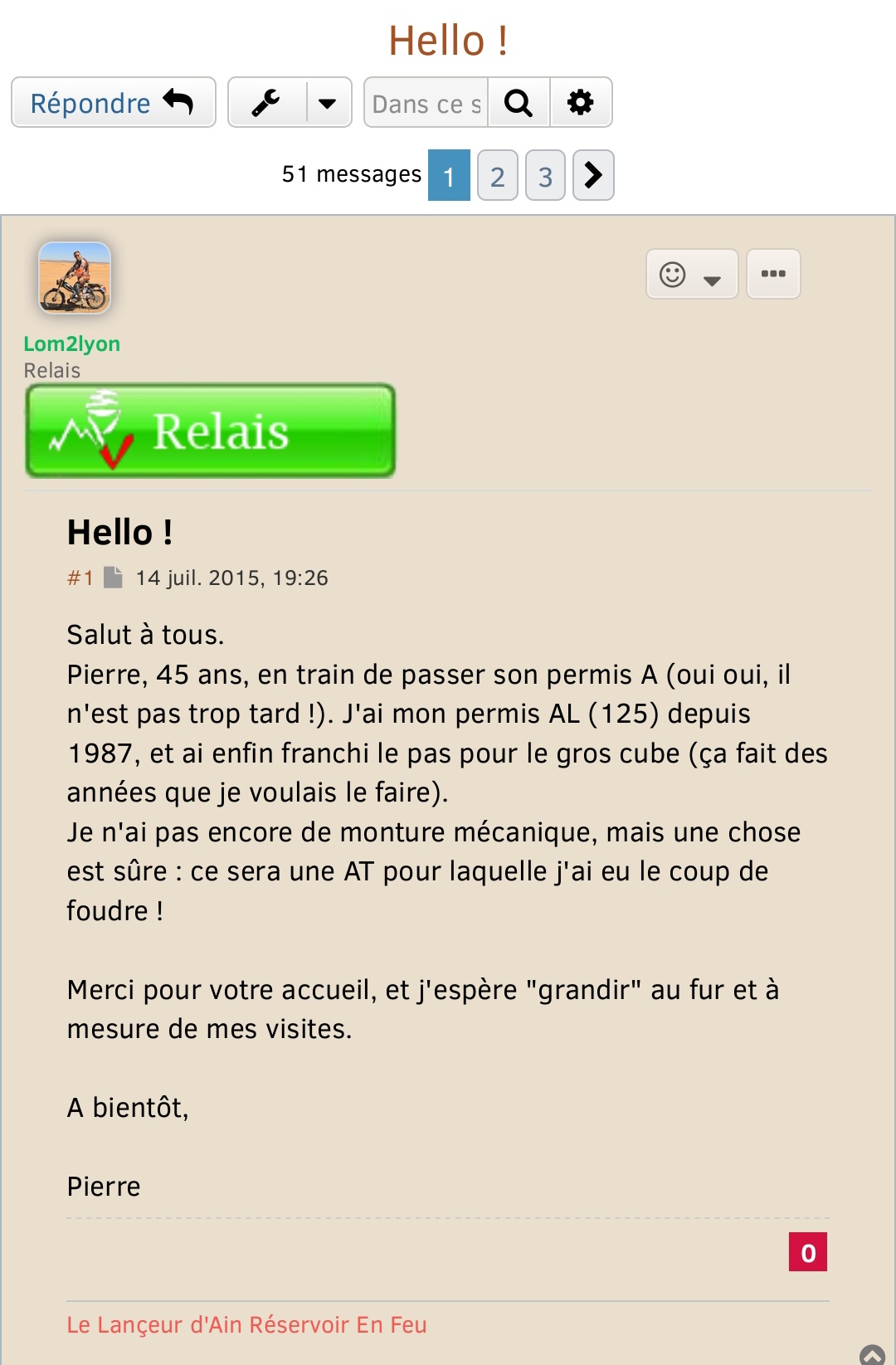 Pour le fun, son 1er message sur le forum il y a pas si longtemps :lol: