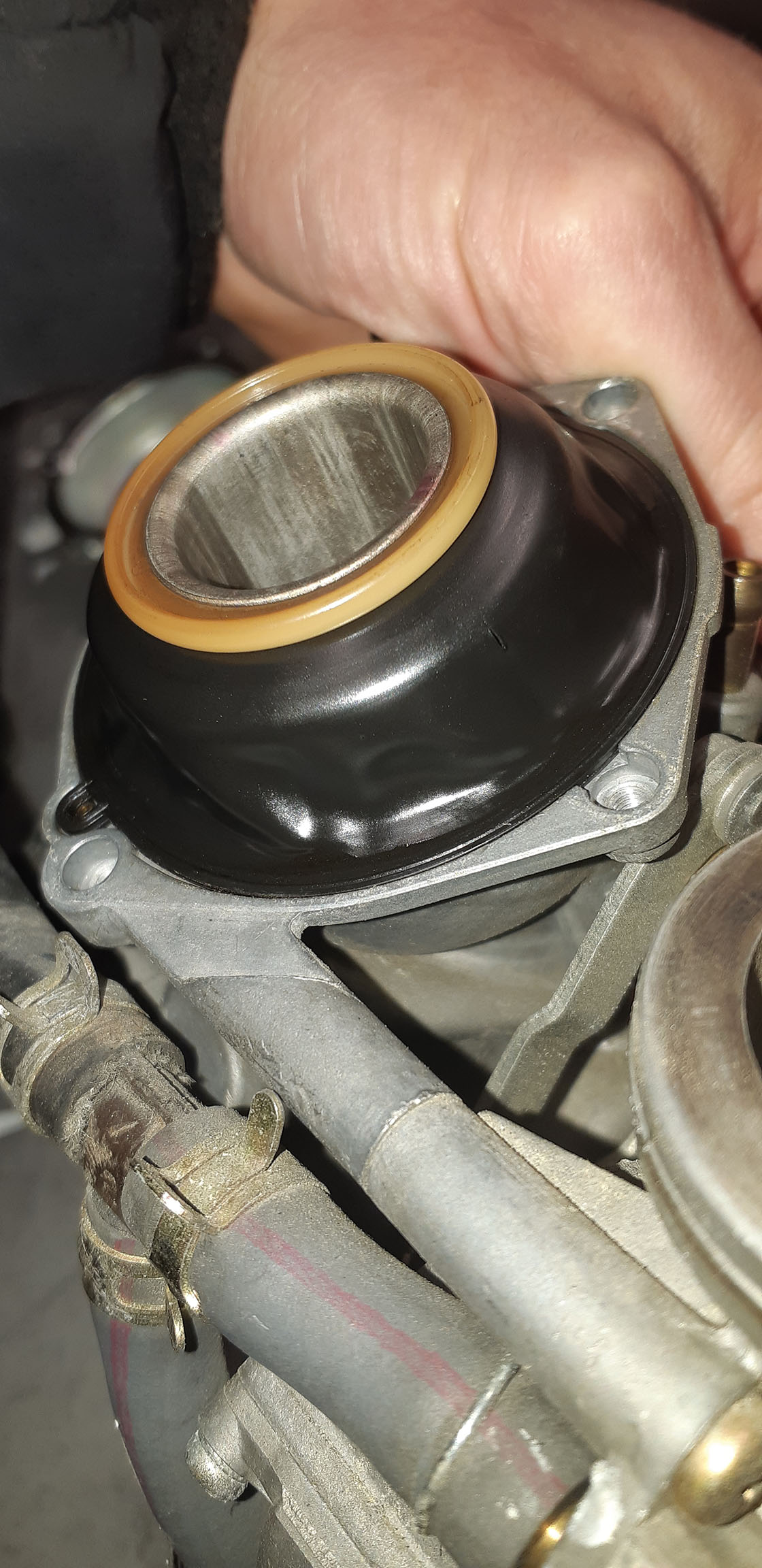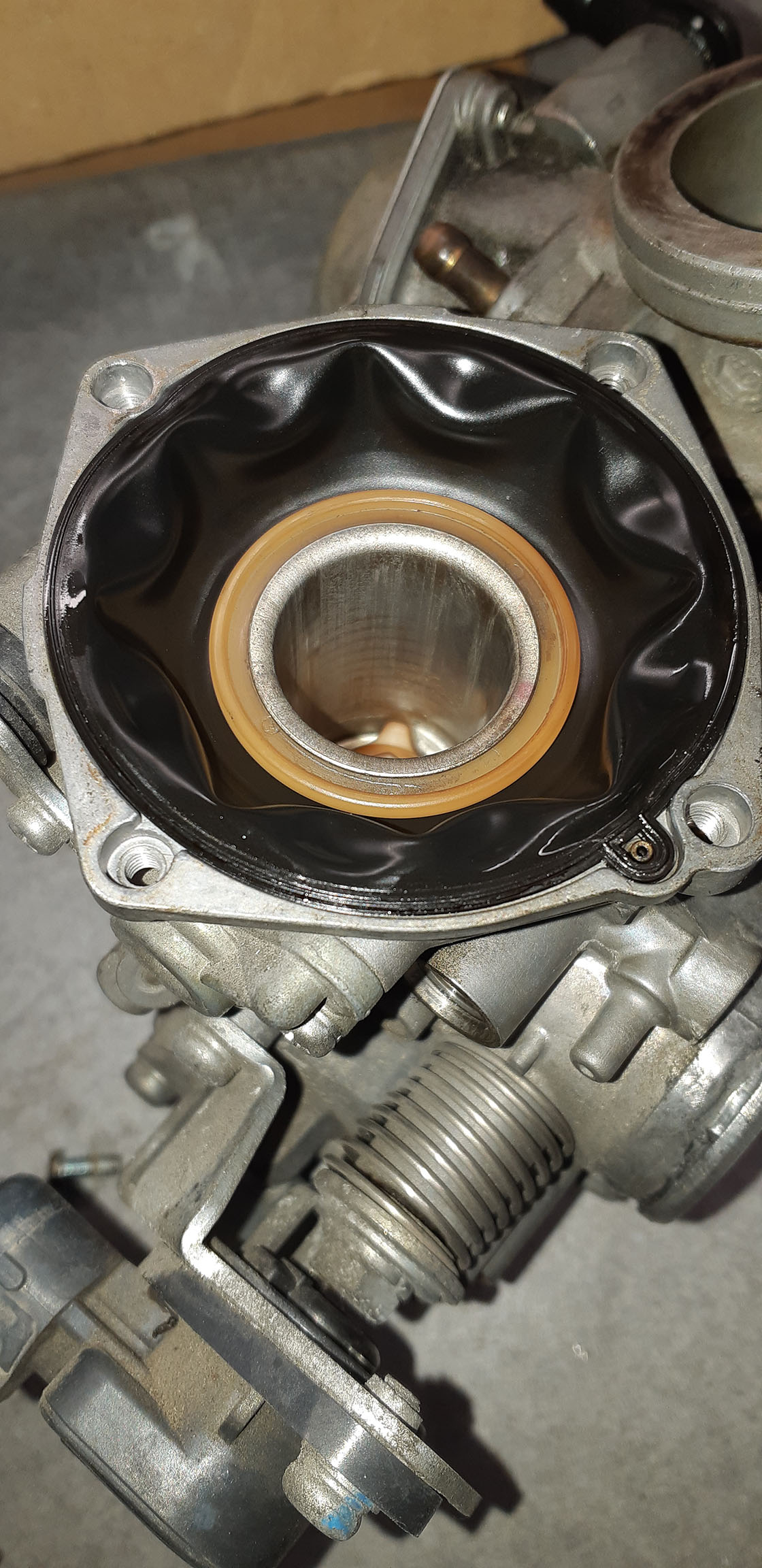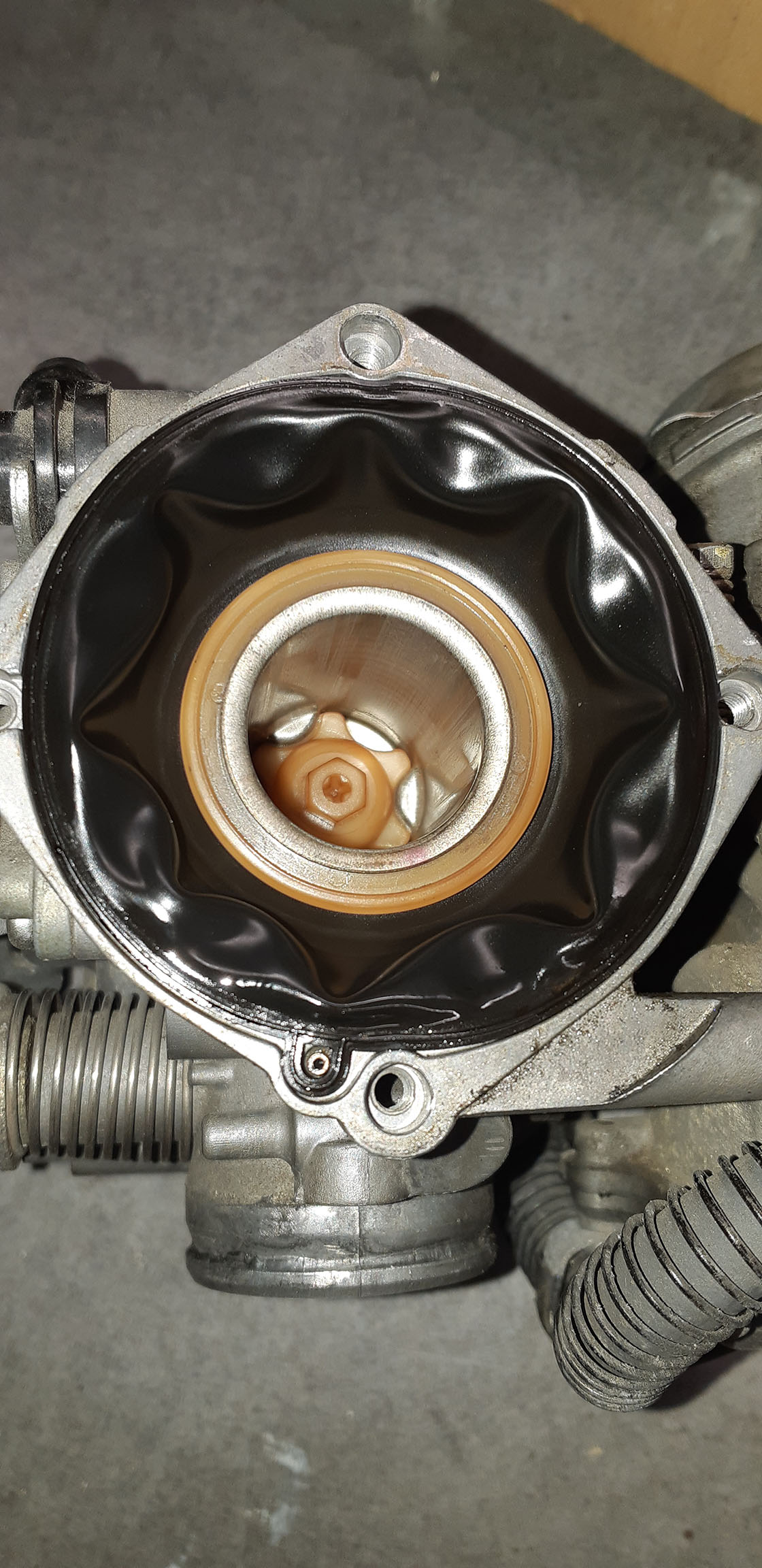 Ca y est, carbus déposés ! Par contre je ne m'imaginais pas du tout les membranes comme ca... Comme vous m'avez dit que c'était bien fragile, je ne les ai pas sortis, faut-il le faire pour pouvoir bien les inspecter ? Les pipes d'admissions paraissent en bon état mais je les changes quand même..