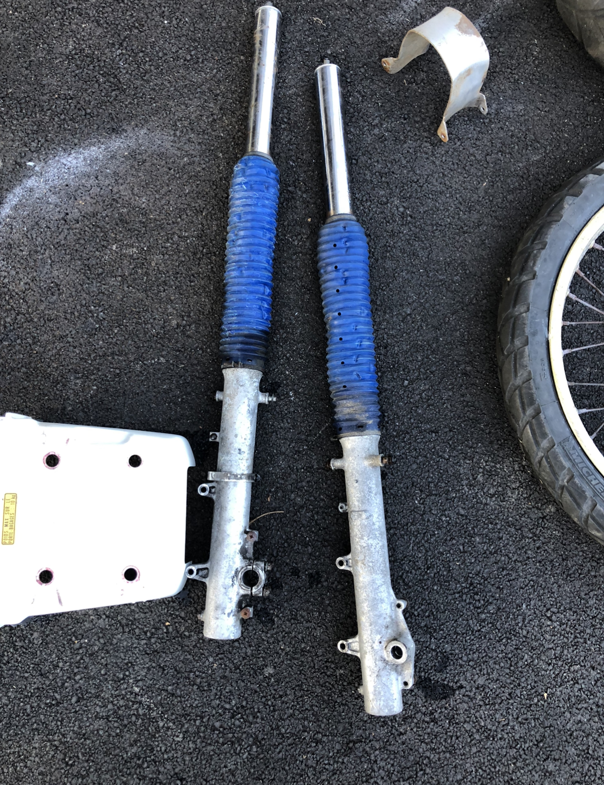 Petite avancée pour moi cet aprem et voici l’état actuel Au niveau des carénages ils sont pas trop mal et je compte les laisser dans leurs jus. Petites Reno des plastiques et vernis sur l’ensemble! Pour La Fourche révision à prévoir avec montage des clapets de @stefter des réceptions. Sablage et peintures. Pour les jantes, sablages Thermolaquage ça sera un jeu pour les sorties TT Objectifs du soir on tombe le bras oscillants et l’amortisseur.