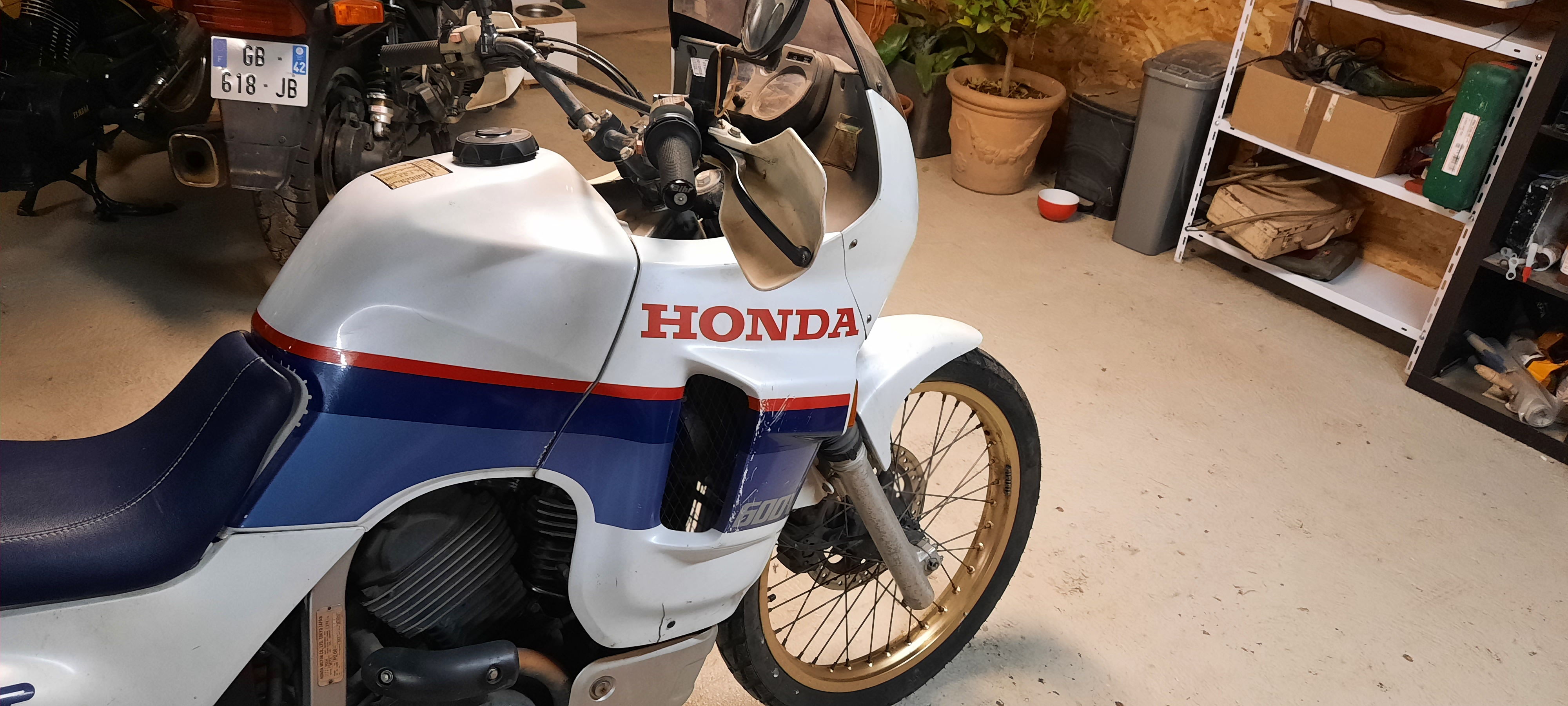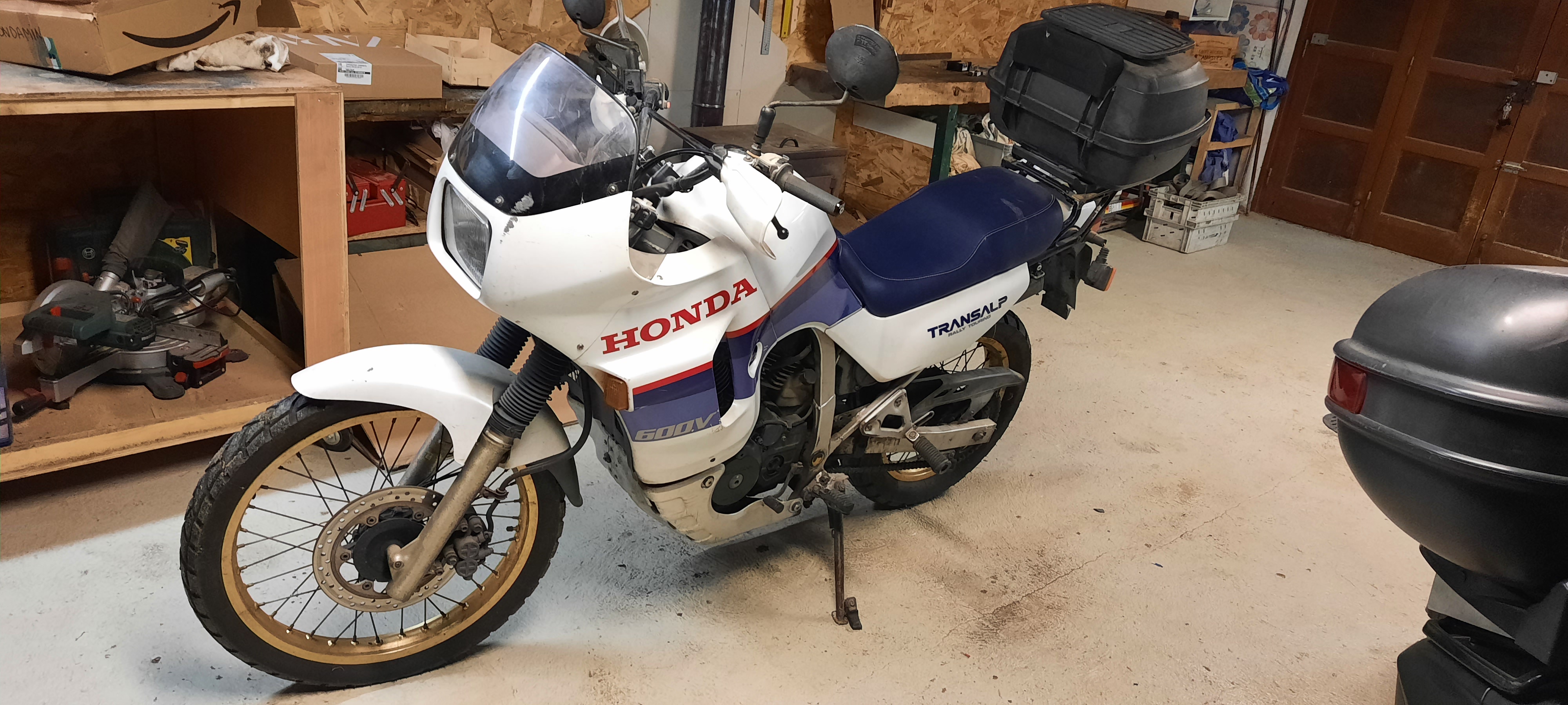 Je viens d'acquérir près de chez moi une transalp 600 de 1987 affichant 77 000km, état esthétique correct avec quelques imperfection par ci par la, elle est complète. Voici des photos lors de l'achat.