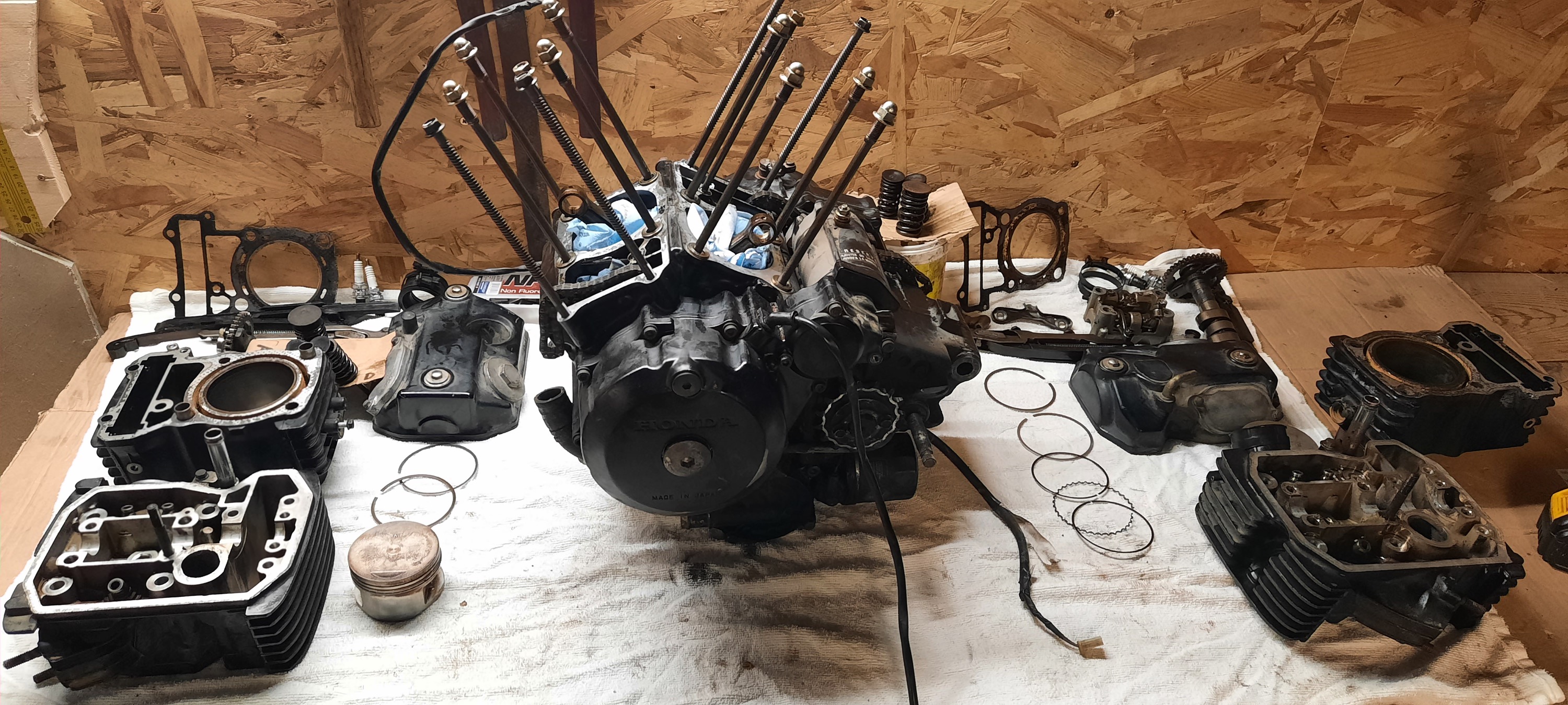 L'ancienne propriétaire à remisé cette transalp depuis bon nombre d'années après surchauffe moteur sévère. Elle n'avait jamais fait le niveau de liquide de refroidissement et a très certainement roulé sans eau pendant quelques kilomètres... Elle me vend la moto avec joint de culasse à changer.