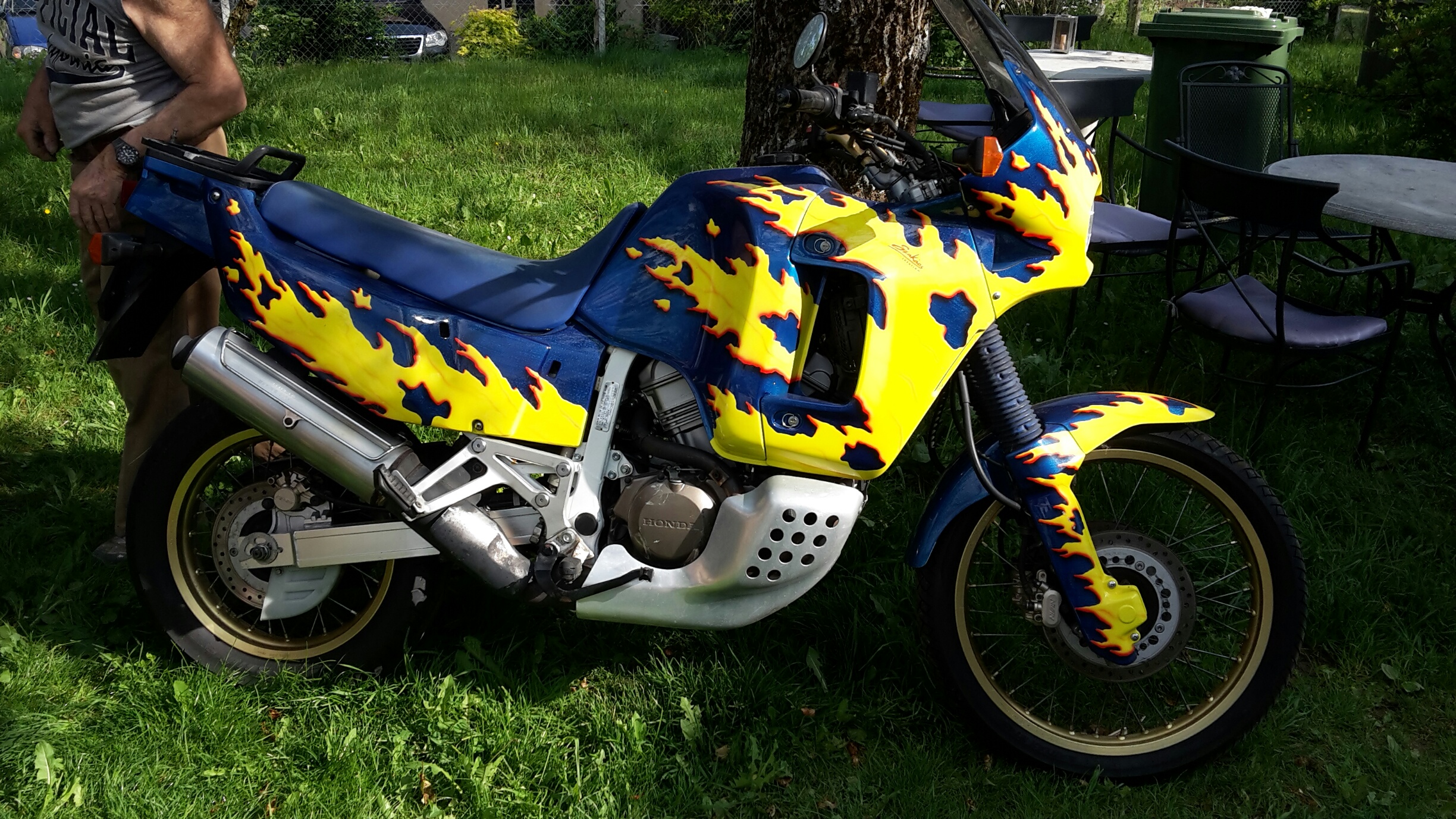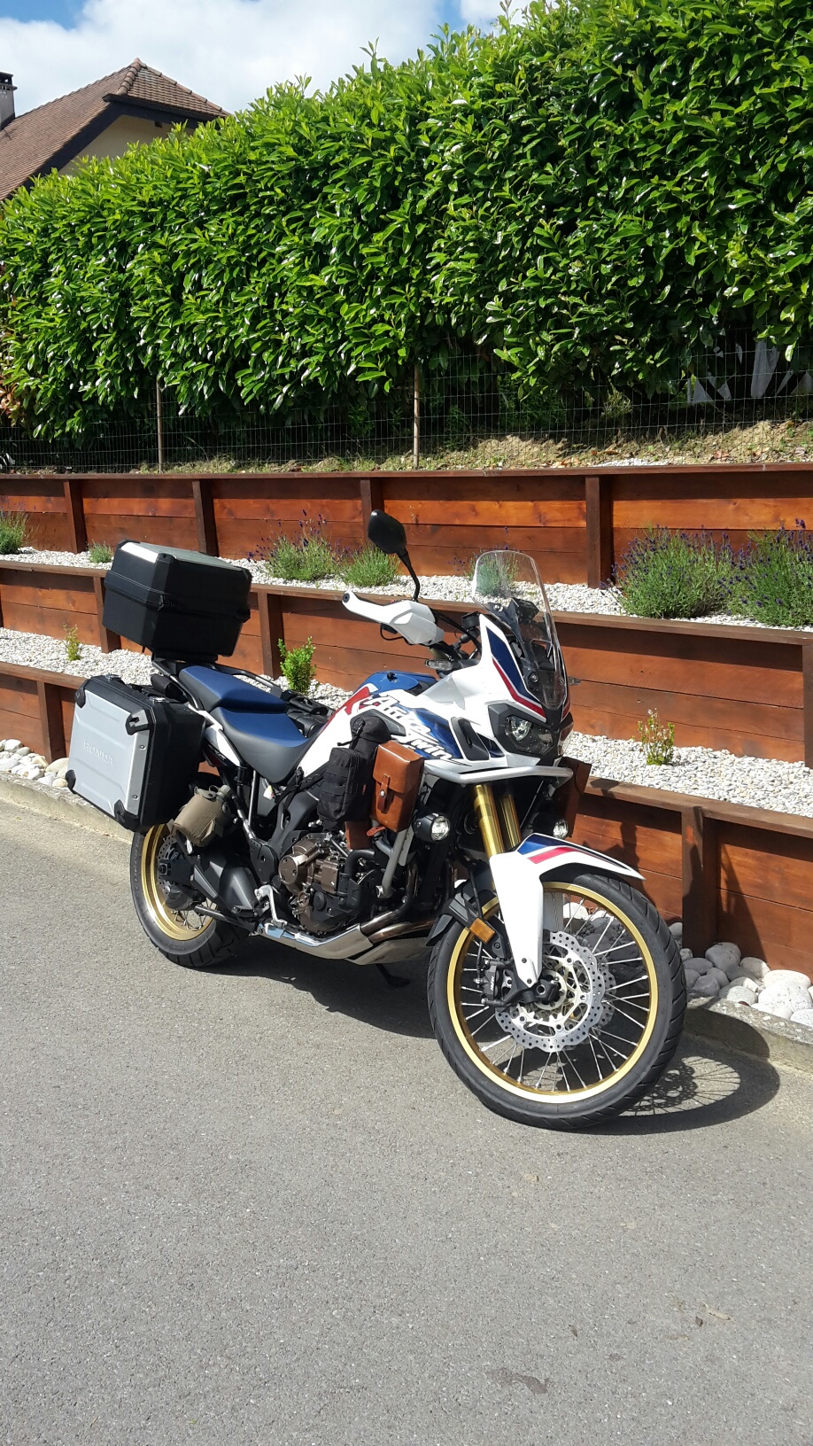 J'étais motard dans ma jeunesse puis j'ai laissé tombé pour rassurer ma famille. Je suis de retour aux affaires depuis 2014 où j'ai acquis une Honda NC700S pour me refaire la main. Vite rassasié par le côté linéaire de cette première bécane, j'ai lorgné, lorgné encore sur les articles traitant de l'arrivée prochaine d'une nouvelle Africa Twin 1000... jusqu'au jour où elle est devenue réalité. J'ai attendu, attendu encore jusqu'au 25 février 2016, jour où ma belle est arrivée. Elle porte le "no 91 Suisse" et, clin d'oeil à nos voisins français, elle est tricolore.