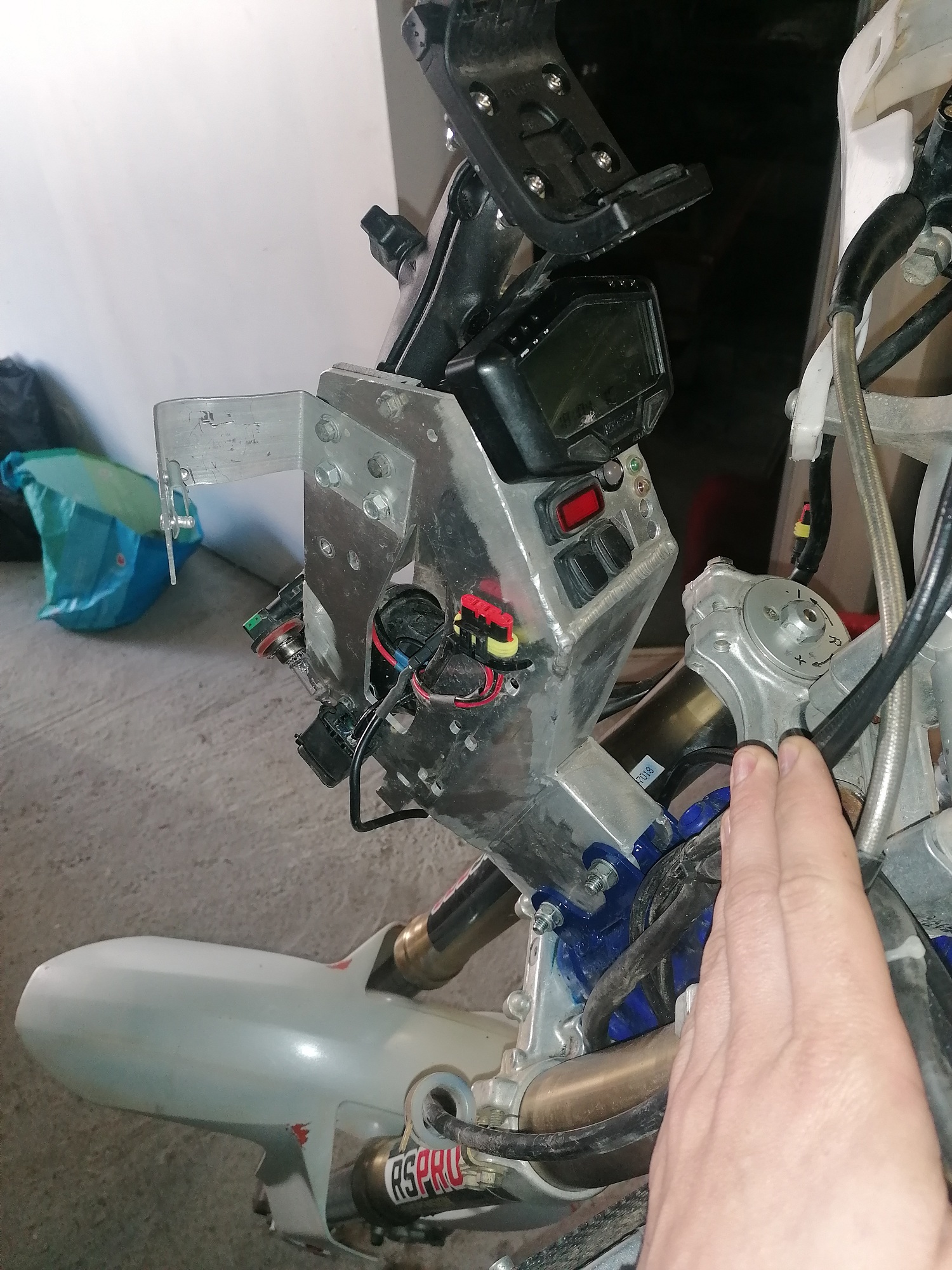 Pendant se temps, montage du train avant, préparation de la fourche, usinage de la colonne de direction, disque de 320mm avec la patte de déport qui vas bien. fabrication et montage de l'araignée, modification du faisceau électrique ....
